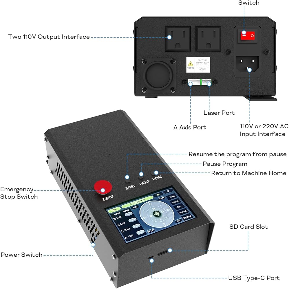 Diversified Control Methods: The 6060 comes standard with an offline controller and power box, containing two 110V sockets that can be controlled to enable or disable through the offline controller, meeting the needs for controlling on/off the power of the trim router and vacuum. The machine can be operated via an offline controller, PC application, or manually. The offline controller has a 2.5-inch display, making it simple and convenient to use. A USB cable is required to connect to a computer application