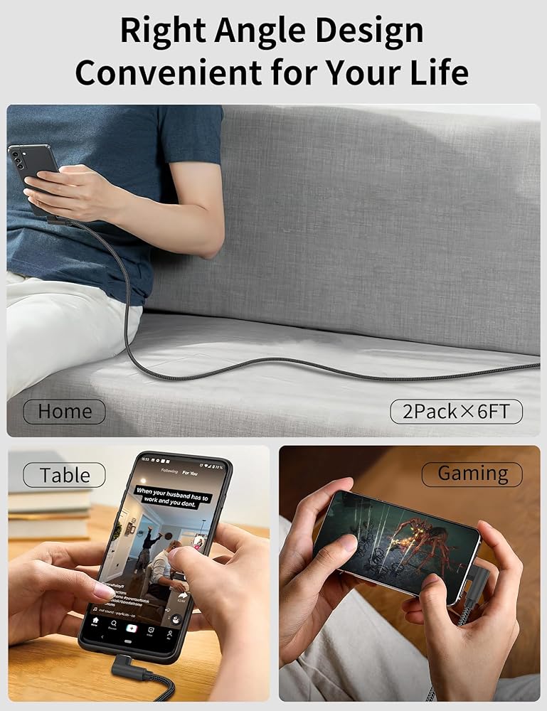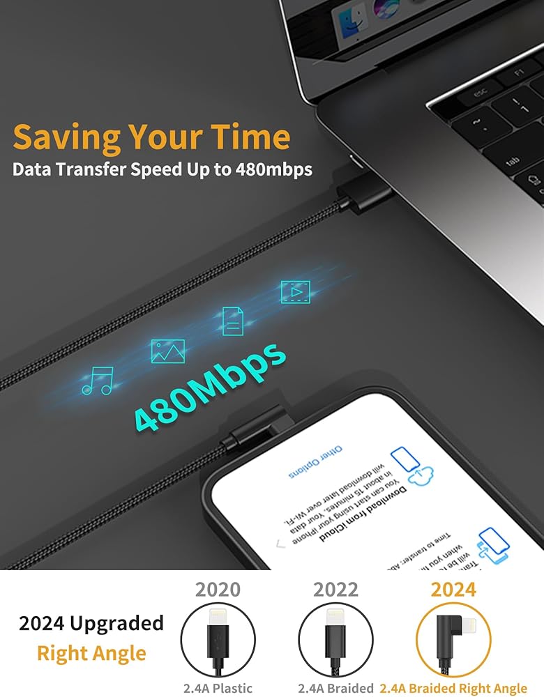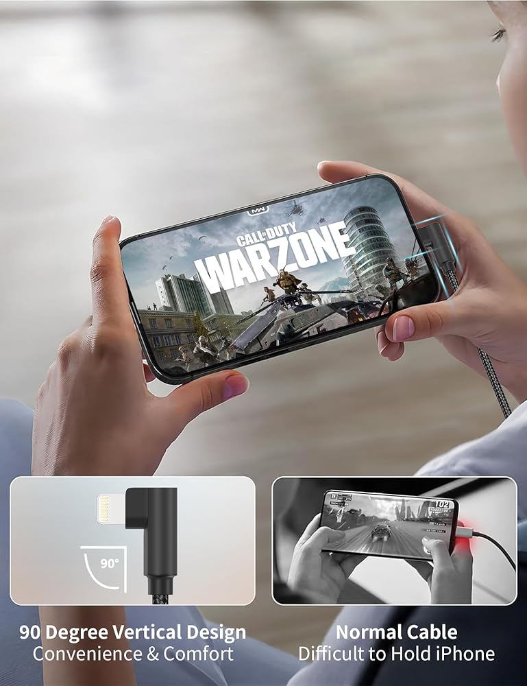 تجربة مستخدم أفضل - كابل USB إلى Lightning على شكل حرف "L" بزاوية 90 درجة مصمم بواسطة مصممين محترفين. فهو يوفر لك أفضل تجربة من الراحة والرفاهية عند ممارسة الألعاب وتصفح TikTok وقراءة الكتب الإلكترونية والمزيد.