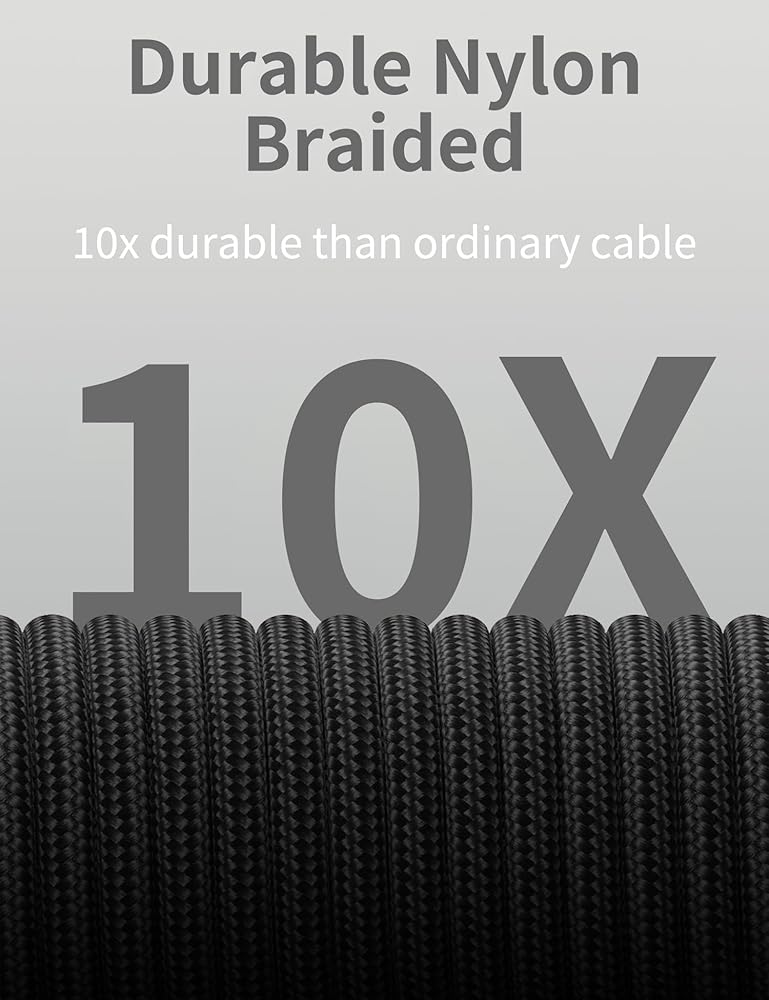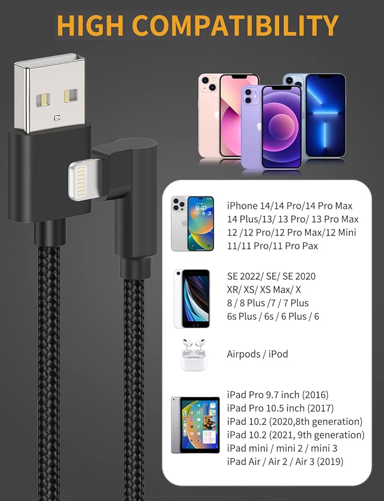 10 × متين، لا يتمزق أبدًا - كابل آيفون بزاوية قائمة بطول 6 أقدام مصنوع من مادة النايلون المتينة. تم اختباره لتحمل الانحناء أكثر من 20,000 مرة، وموصل معزز واتصال كابل مما يجعله متينًا 10 مرات من الكابلات العادية.