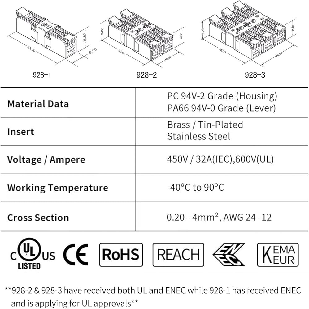موصلات أسلاك الرافعة الآمنة والمتينة: علبة موصل سلك الرافعة المضمنة ذات 4 اتجاهات مصنوعة من مادة عازلة للكمبيوتر الشخصي عالية الجودة. تتميز الموصلات السلكية بمزايا المتانة طويلة الأمد، ومقاومة التآكل، ومقاومة درجات الحرارة العالية، ومقاومة الشيخوخة. يمكن للموصلات الكهربائية السريعة أن تمنع التسرب بشكل فعال. حصلت موصلات Dicio المضمنة على شهادات السلامة UL وCE. يمكنك العثور على شعار الشهادات على كل موصل سلك كهربائي Dicio