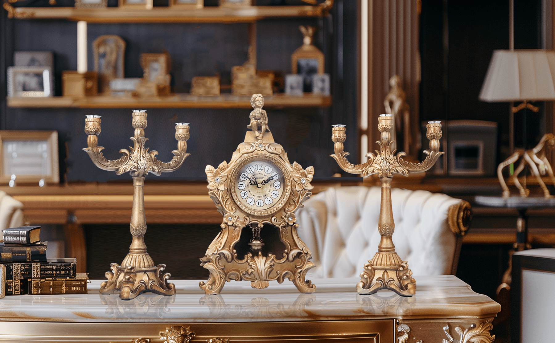 • الشمعدانات المتطابقة: تشتمل مجموعة الساعة العتيقة على شمعدانين مع ثلاثة حوامل لكل منهما، مزينة بتصميمات زهور معقدة تكمل الساعة بشكل جميل.