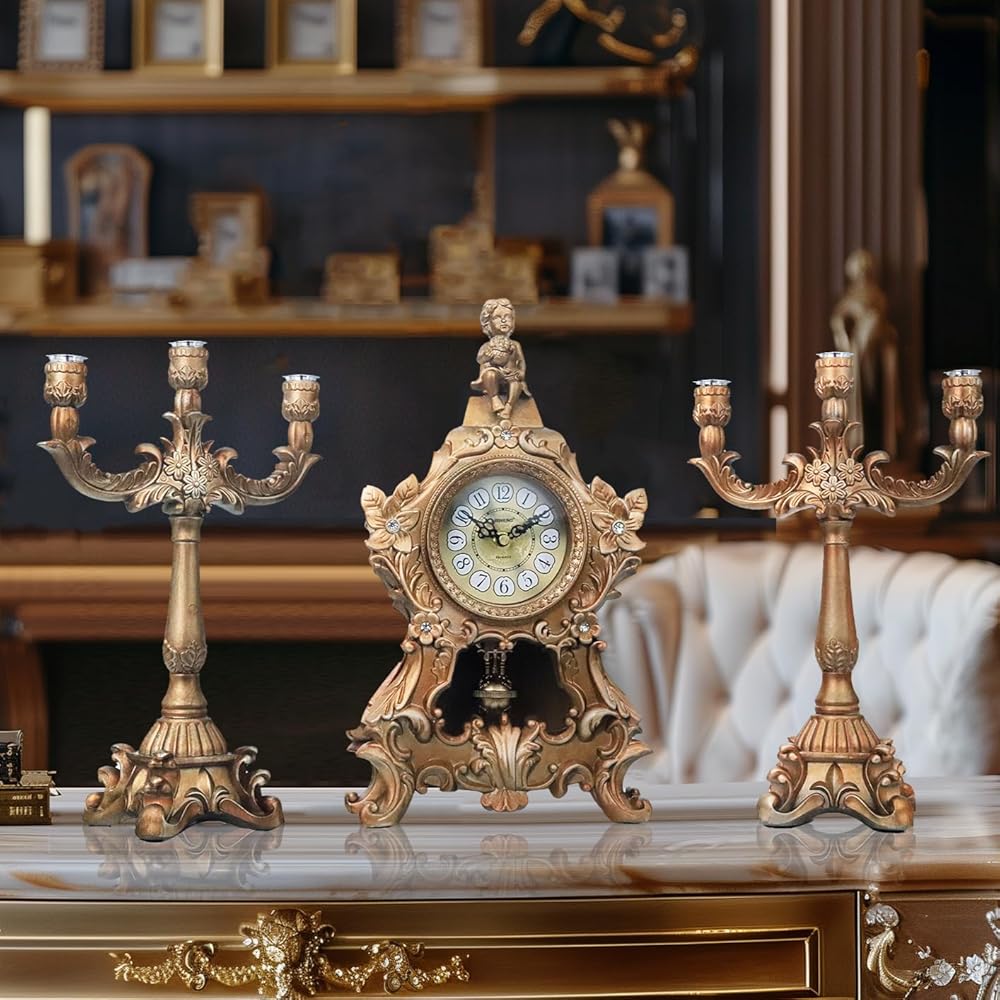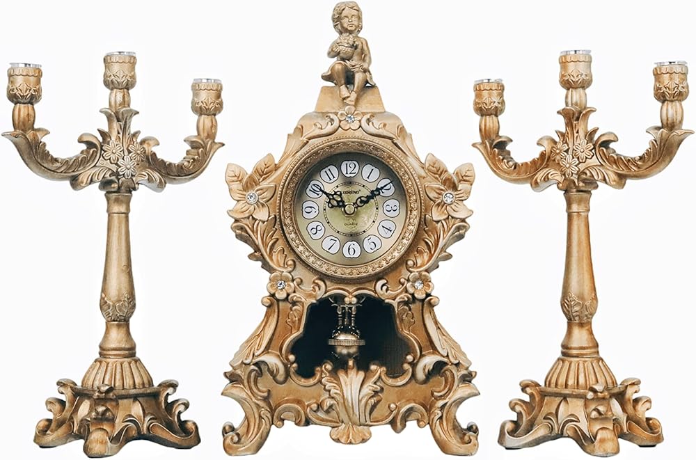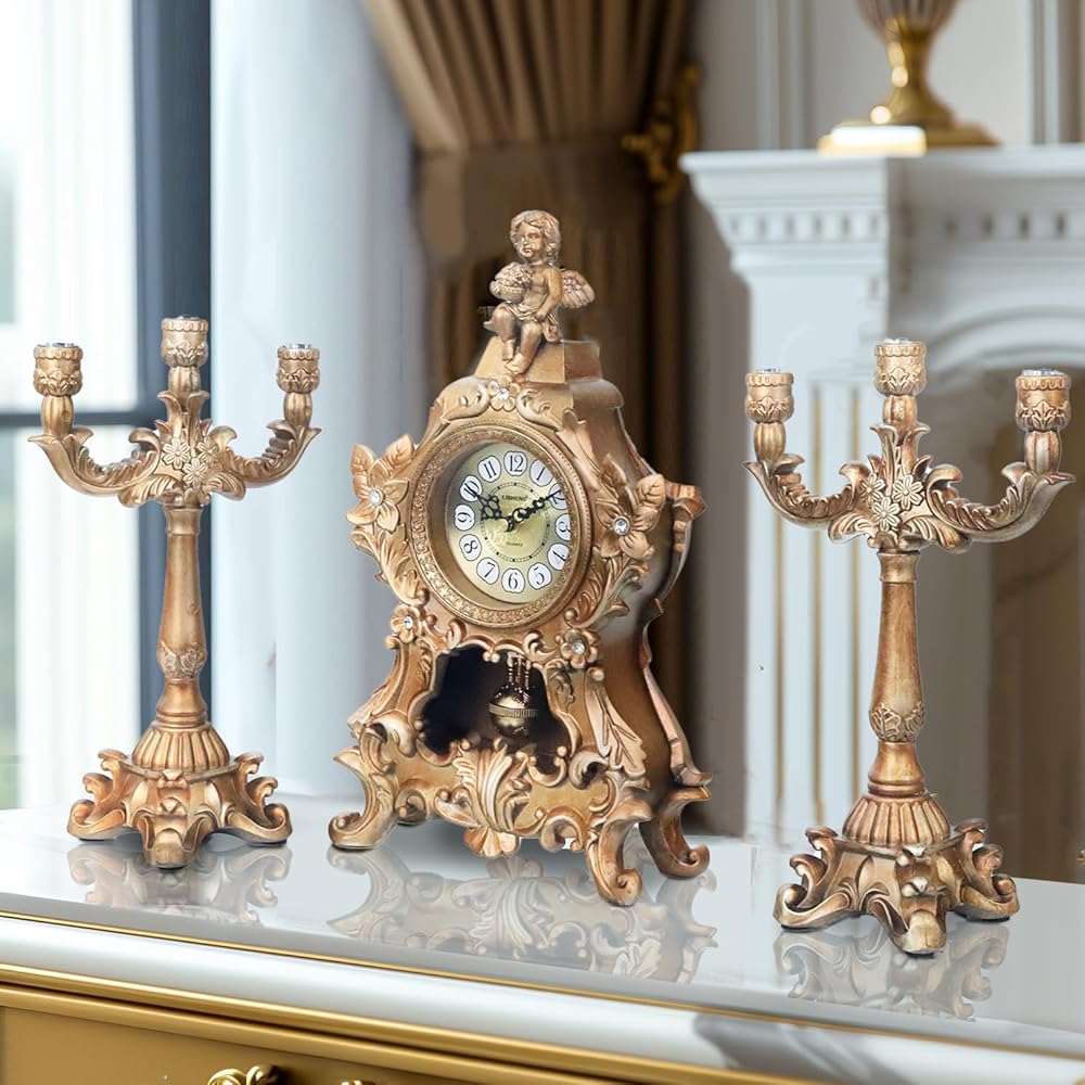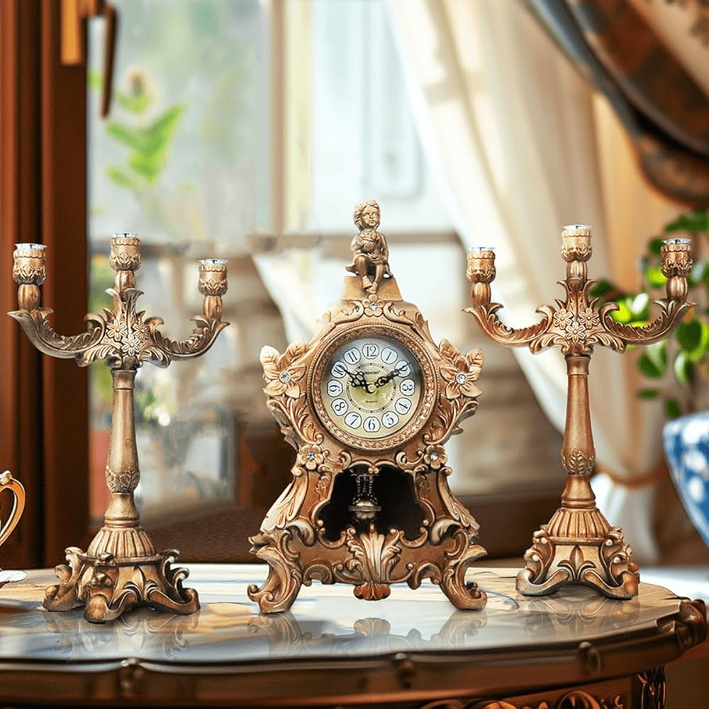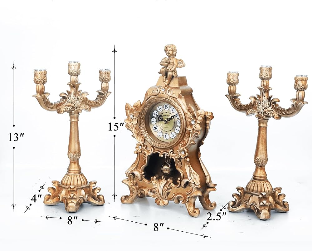 15''h الباروك العتيقة البندول ساعة الروكوكو نمط رف ساعة مع 2 الشمعدانات حاملي الشموع الراتنج ساعة مكتب ساعة الذكرى السنوية لغرفة المعيشة غرفة نوم ديكور مكتب
