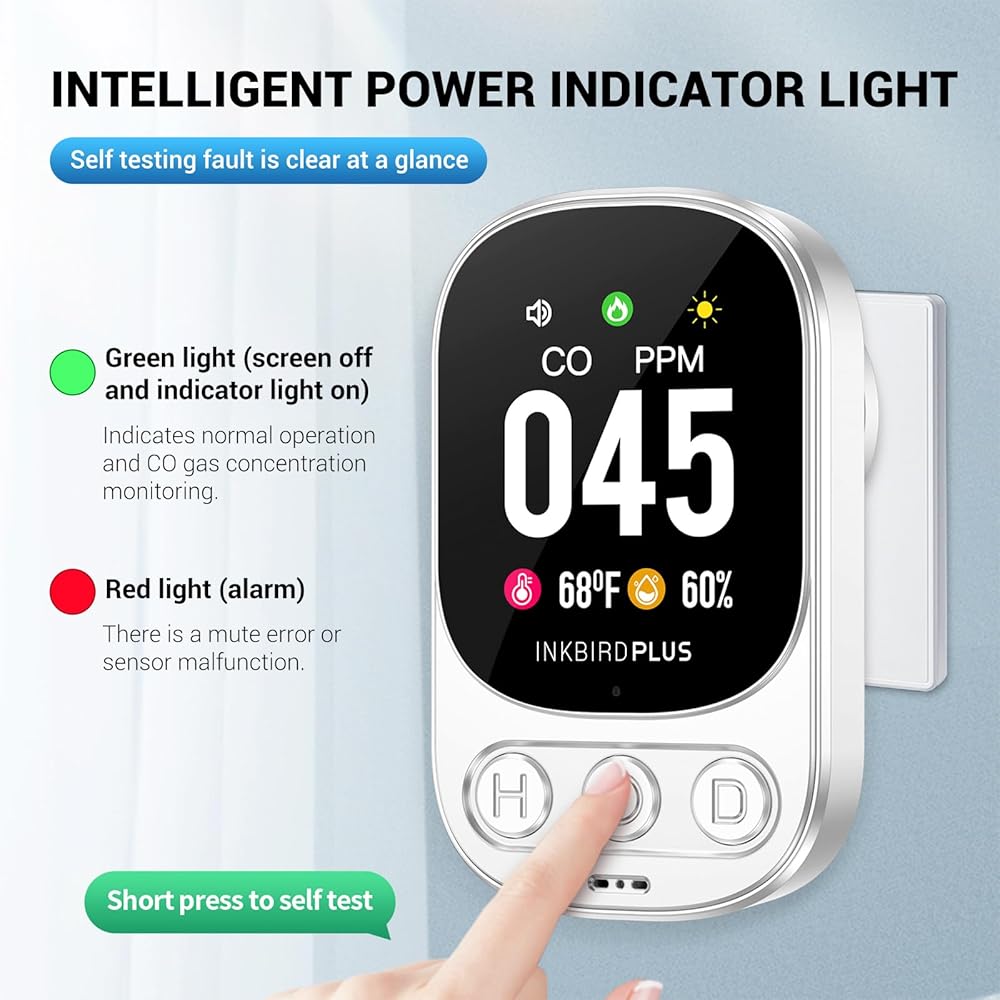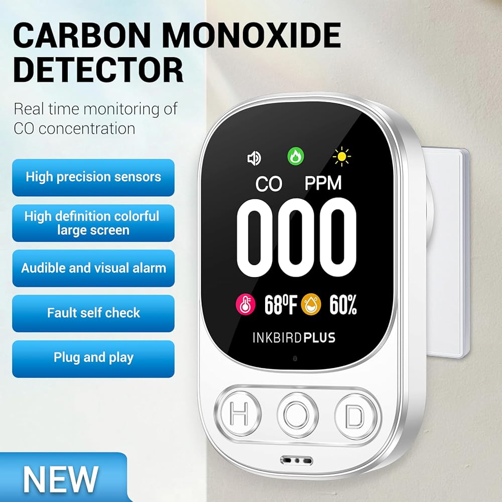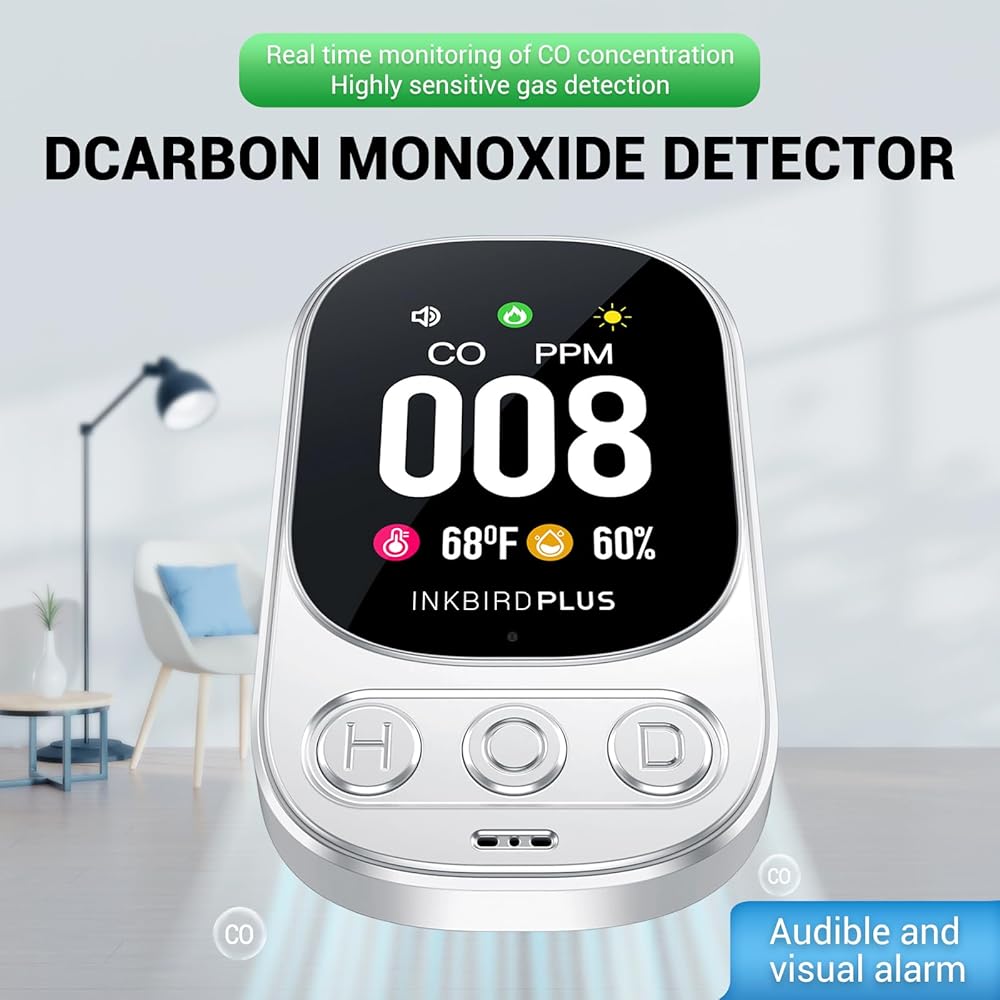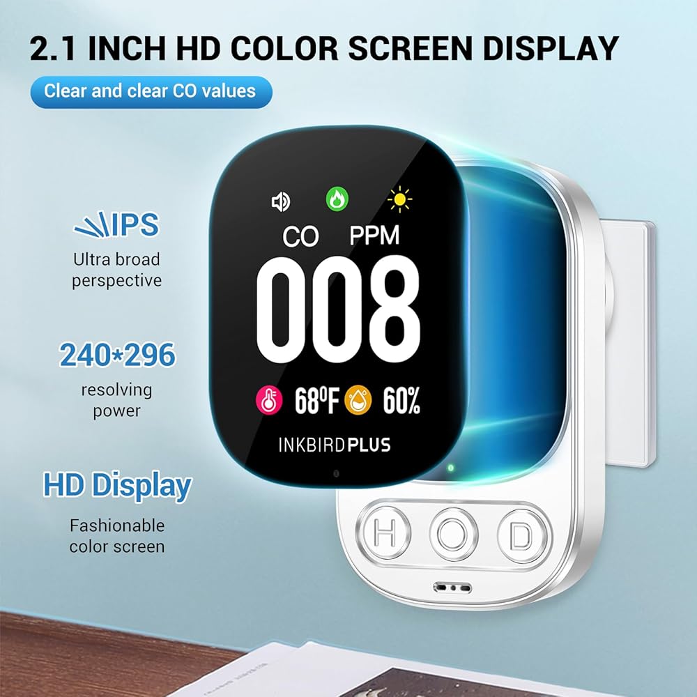 إنذار أول أكسيد الكربون INKBIRDPLUS HD08 كاشف أول أكسيد الكربون مع إنذار، جهاز مراقبة جودة الغاز 3 في 1، مقياس رطوبة درجة حرارة ثاني أكسيد الكربون، جهاز مراقبة غاز ثاني أكسيد الكربون، المنزل والفندق، الرحلات والتخييم RV
