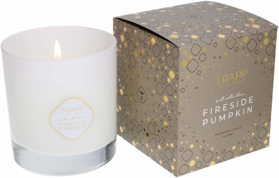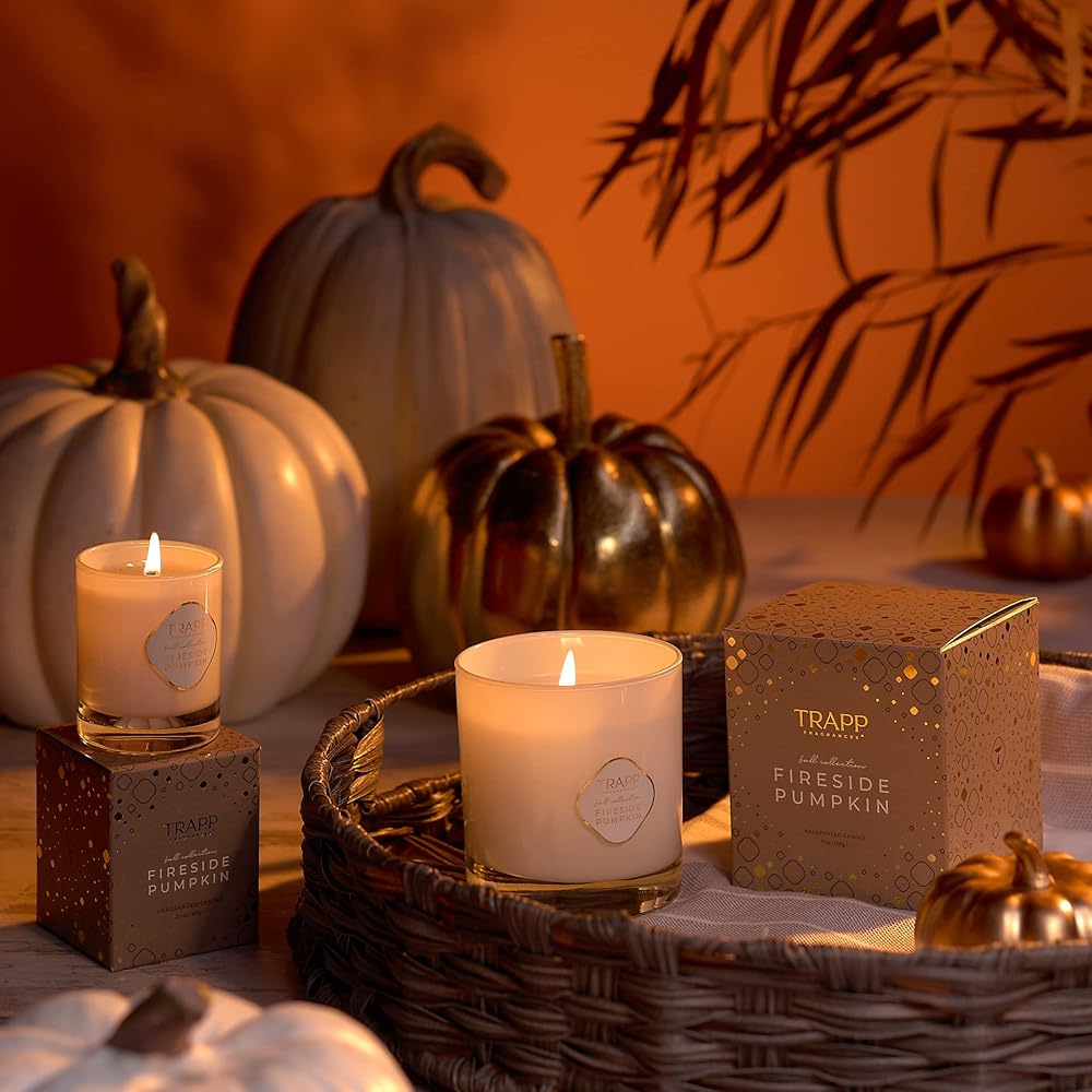 New england pumpkin, smoky spices, and smoldering coals meld to conjure the aura of fall. Escape to a rustic cabin, enveloped in the comforting scent of pumpkin and spices while sipping warm cider while nestled next to a crackling fire emitting a hit of smokiness. Embrace the cozy nostalgia of fall evenings and create lasting memories. Immerse yourself in the allure of our poured petrolatum wax, delivering an even, clean burn that lasts up to 50 hours. Say goodbye to tunneling and soot, and embrace the elegance that defines our fragrance candles. Embody the spirit of the season in your home or as a gift. Trapp's seasonal series of votive candles are formulated to fill a room with a luxurious atmosphere full of life, where fragrances become chapters of your narrative, unlocking memories, and creating ambience with every scent. Unwrap sophistication, elegance, and charm of the season. Poured in a white glass vessel and adorned in a special seasonal design of our signature box, this candle is the perfect gifting statement that says, "cherish me." great for birthdays, holidays, housewarming, and mother's day, and more! create moments that linger and memories that entwine with trapp's dancing flames. Every flicker ignites life, making your presence felt even when you're away. The Trapp product line was founded in Kansas City, Missouri in the early 1990s by interior and floral designer Bob Trapp. He sold the brand in 1994 to his friends at Faultless Brands, a fifth-generation family-owned company headquartered in Kansas City. Throughout the decades, the Trapp philosophy has remained the same. We're set apart by our unmatched fragrance quantity and our mission to use only the highest quality fragrances. We guarantee that every product will fill your room with fragrance in minutes, creating an environment that feels like home every single day.