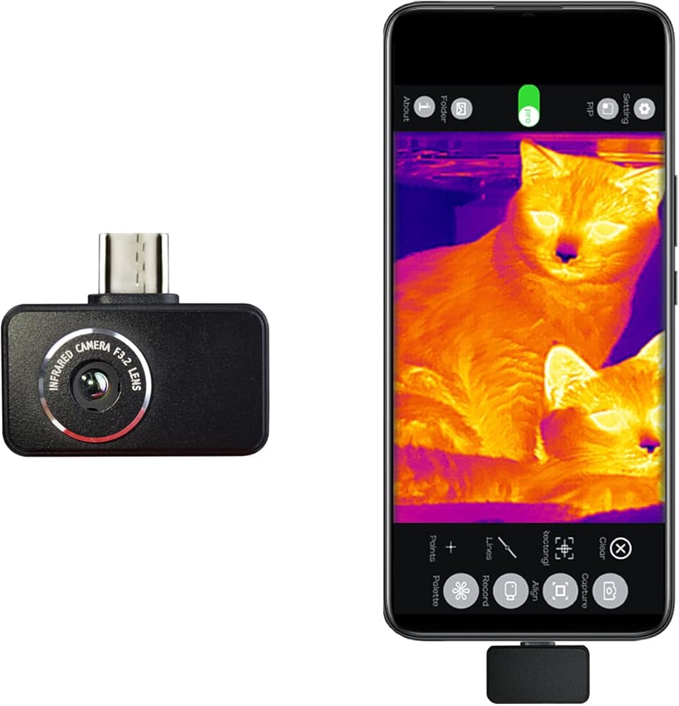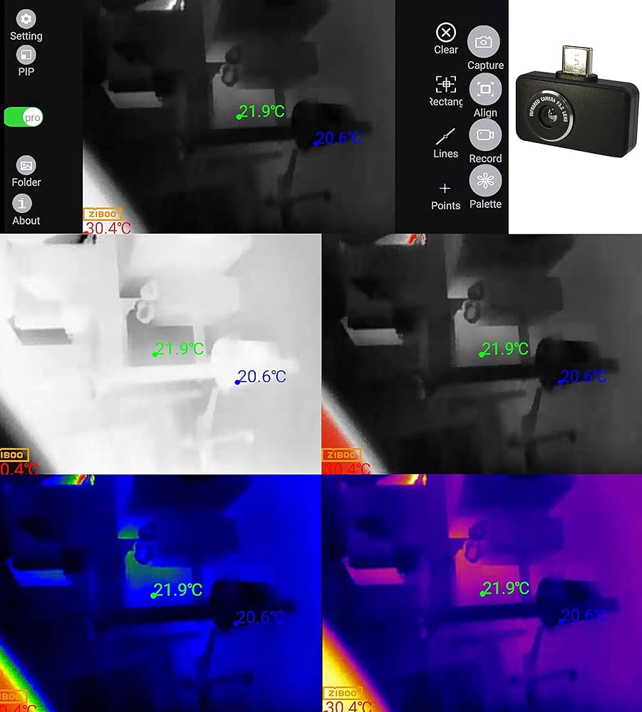 ZIBOO Mobile Thermal Camera Image capture. Video recording. Easy App Control. Quick and easy analysis on smart phone. Android USB-C & Micro USB Switching. Extension cord for multiple uses. No batteries. No charging. . More features Image capturing modes. Take photos or videos. Image format. JPG. IR resolution. 256x 192 pixels ℃/℉ switch. Range: -20℃~170℃(-4℉~338℉). 6 palettes:White/Black hot and 6 color palettes 3 display modes: Thermal, blending(blend with image of mobile phone ), PIP. Measurement accuracy: ±3℃/±3%. Field of view (FOV) 56.0°x42.2° 2 meter drop durability. Programmable Hi-Low limits of the visual and audible alarms for wider and safer applications. How it works Free download and Easy App Control (Android 6.0 and above). Transform your android phone/tablet into an all-purpose thermal imaging camera. Find and fix faster by seeing problems invisible to the naked eye. For use at home, jobsite, and more.