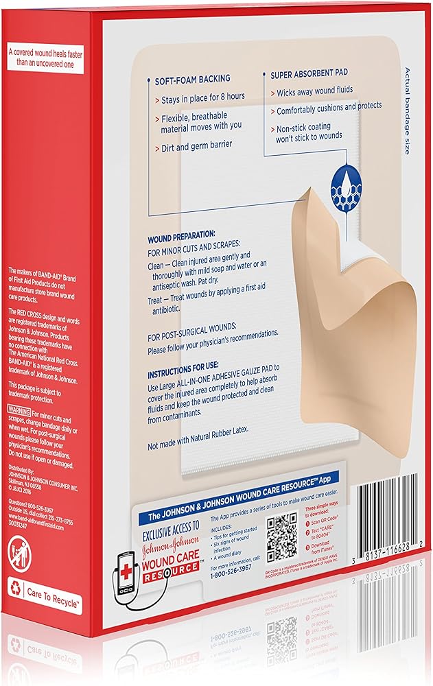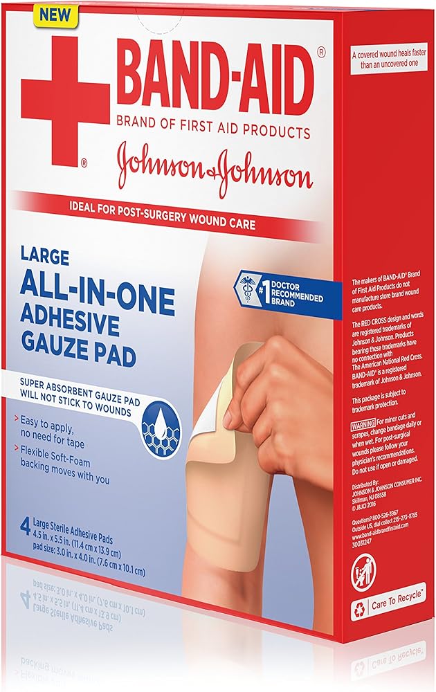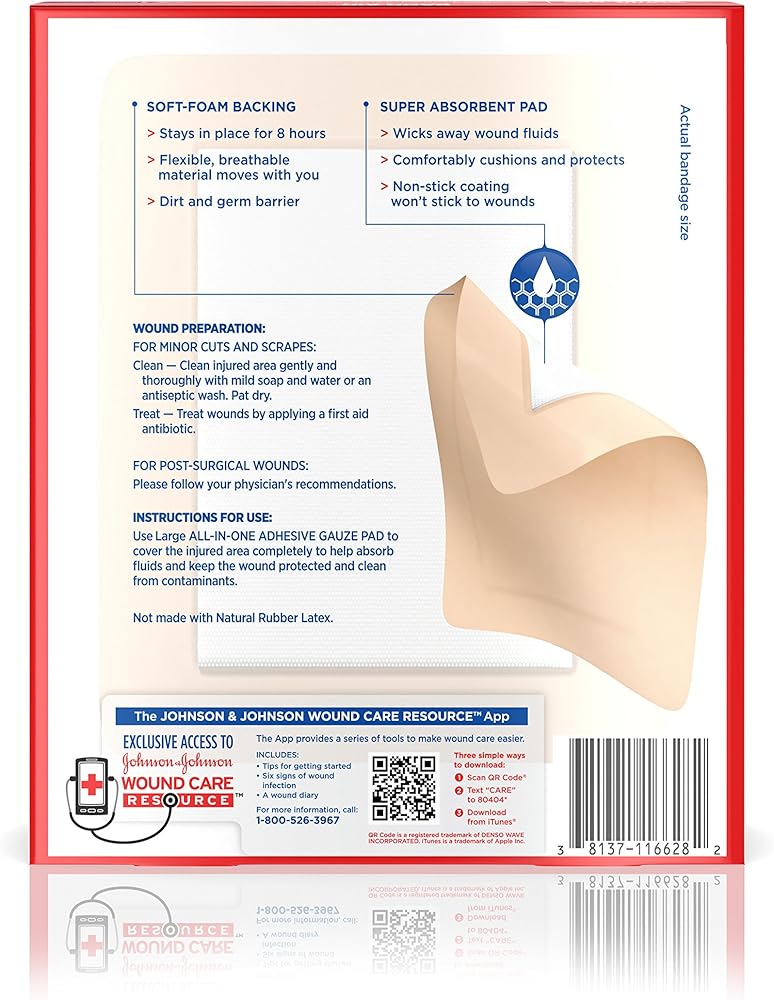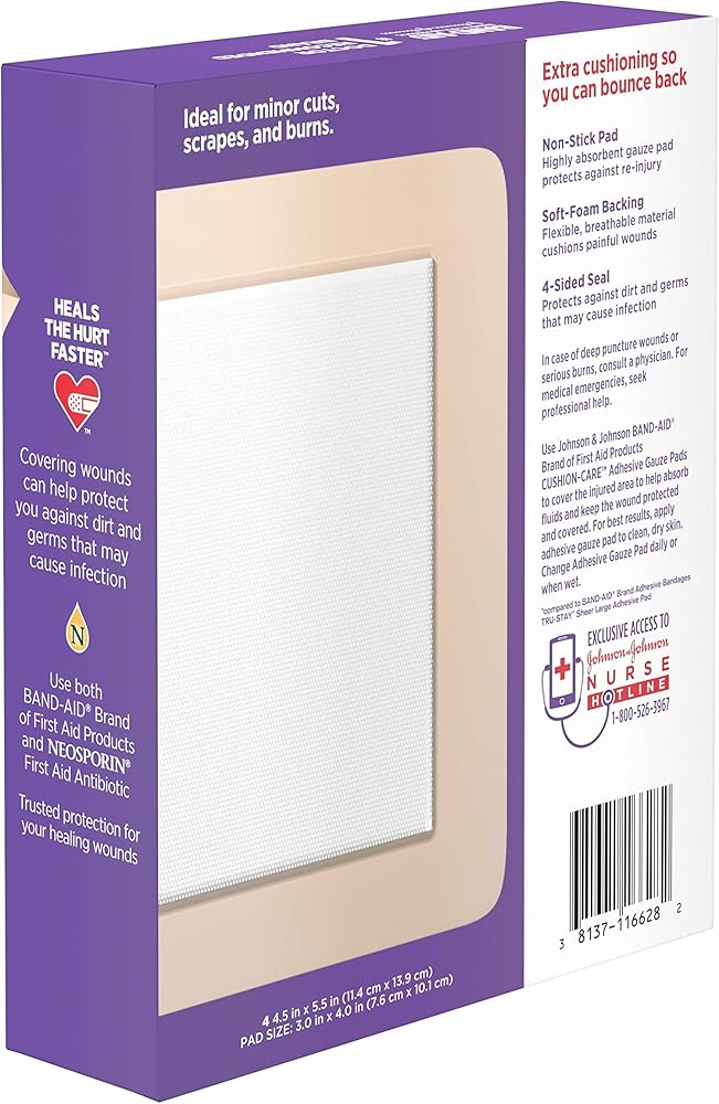 Band-Aid Brand of First Aid Products Cushion-Care Adhesive Sterile Gauze Pad cushions and protects your wounds. Made with a flexible soft-foam backing, this breathable adhesive gauze pad moves with you and stays in place for eight hours. This highly-absorbent first aid gauze pad wicks away wound fluids while forming a protective barrier against dirt and germs. This easy-to-apply and breathable adhesive gauze pad is not made with natural rubber latex. Gauze comes in size large and measures 4.5 inches by 5.5 inches.