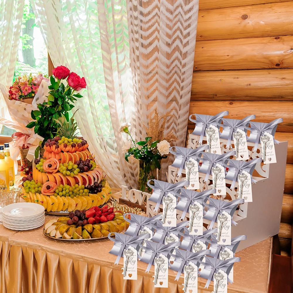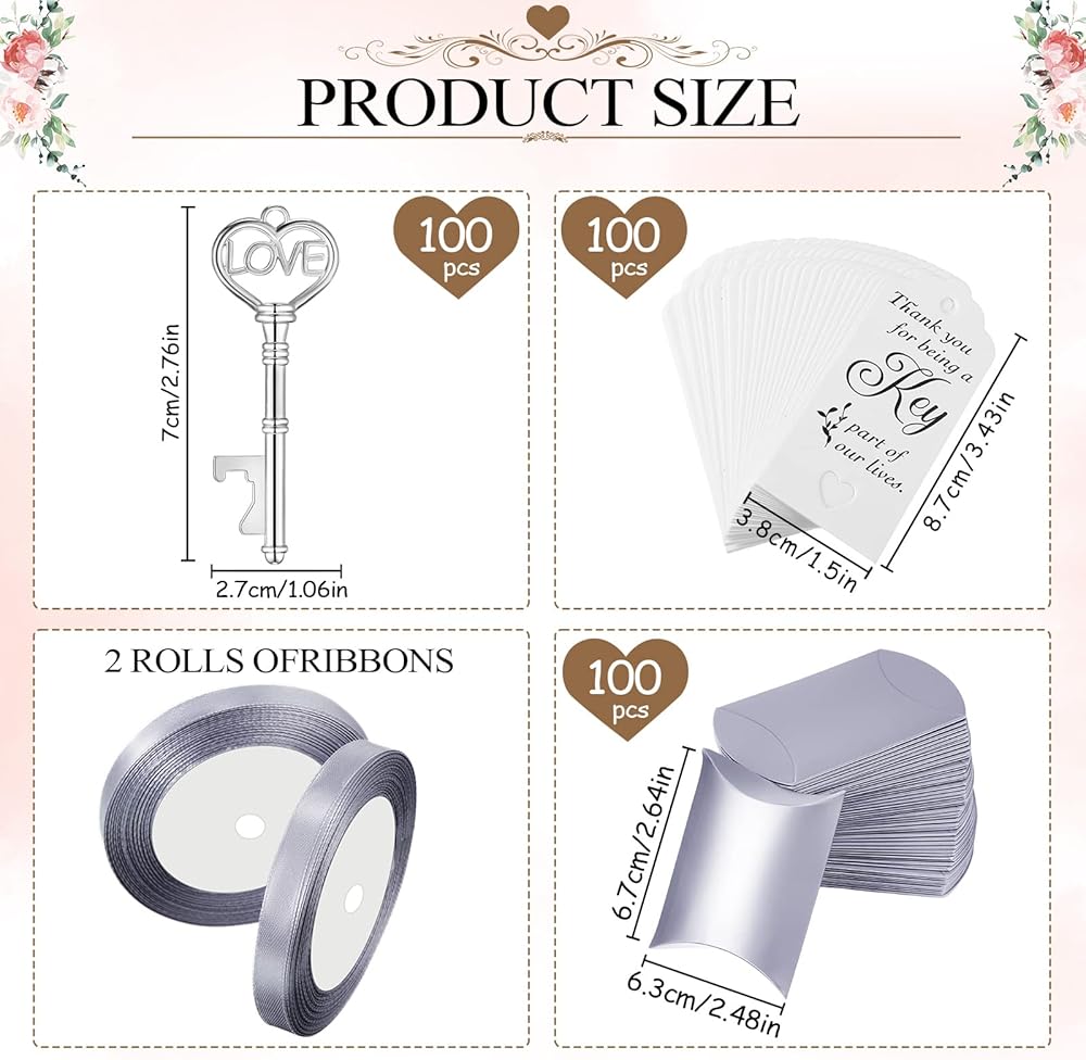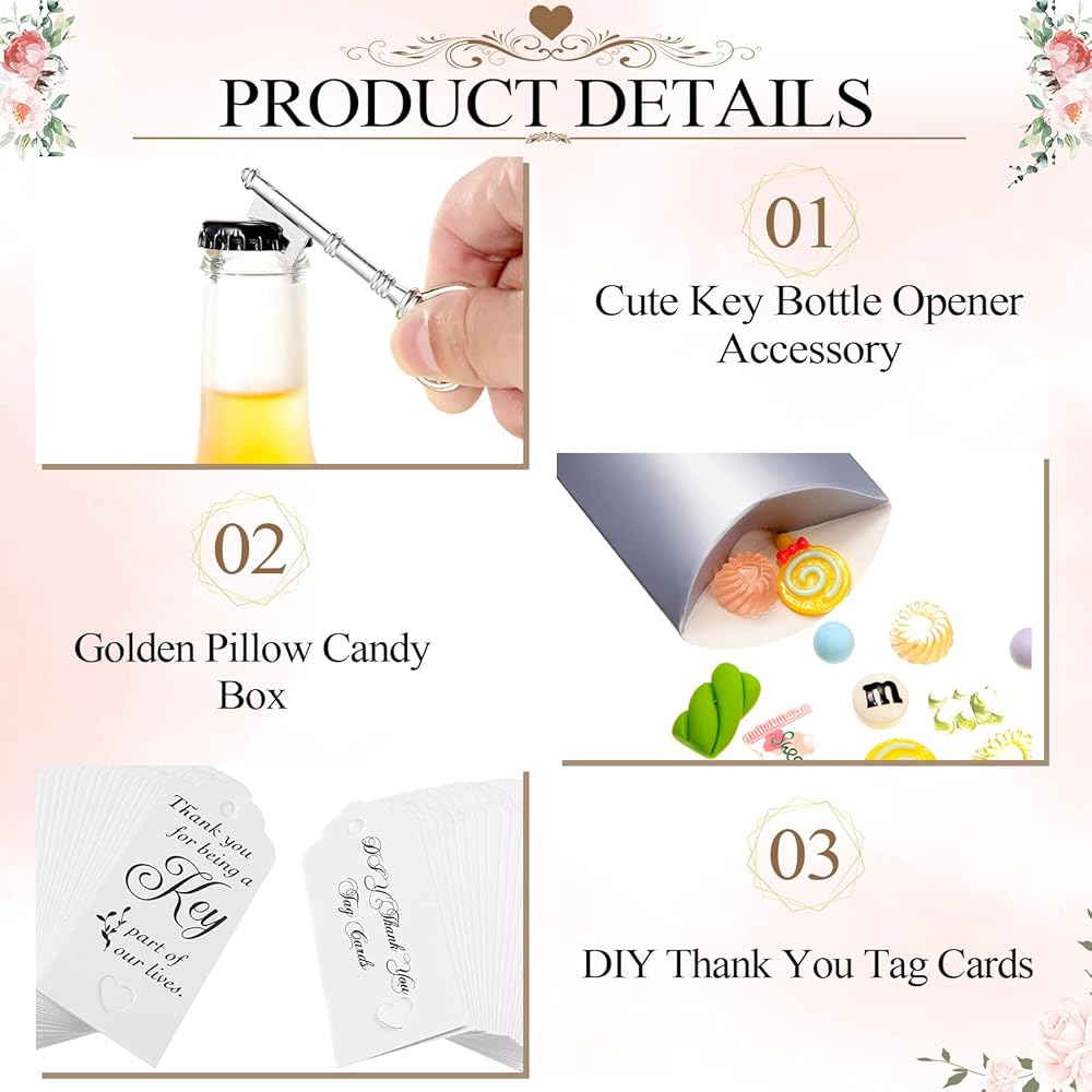 • Complete Set: Includes 100 vintage key bottle openers, matching gold pillow candy boxes, satin ribbons, and elegant white thank you tags; This set will emphasize your wedding decor with a touch of vintage or royal style and make your party particular and memorable