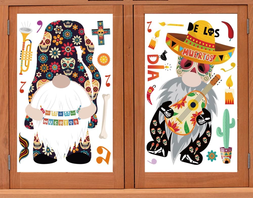 Day of the Dead Design: The window clings feature Day of the Dead theme design, including sugar skulls, bones, skeletons, guitars, flowers, gnomes, cats and other unique patterns, the prints are vivid, bright, vibrant and attractive.