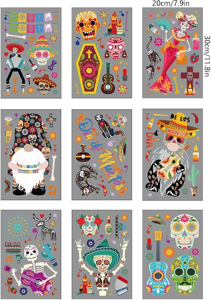 Package includes: 9 sheets Day of the Dead window cling stickers