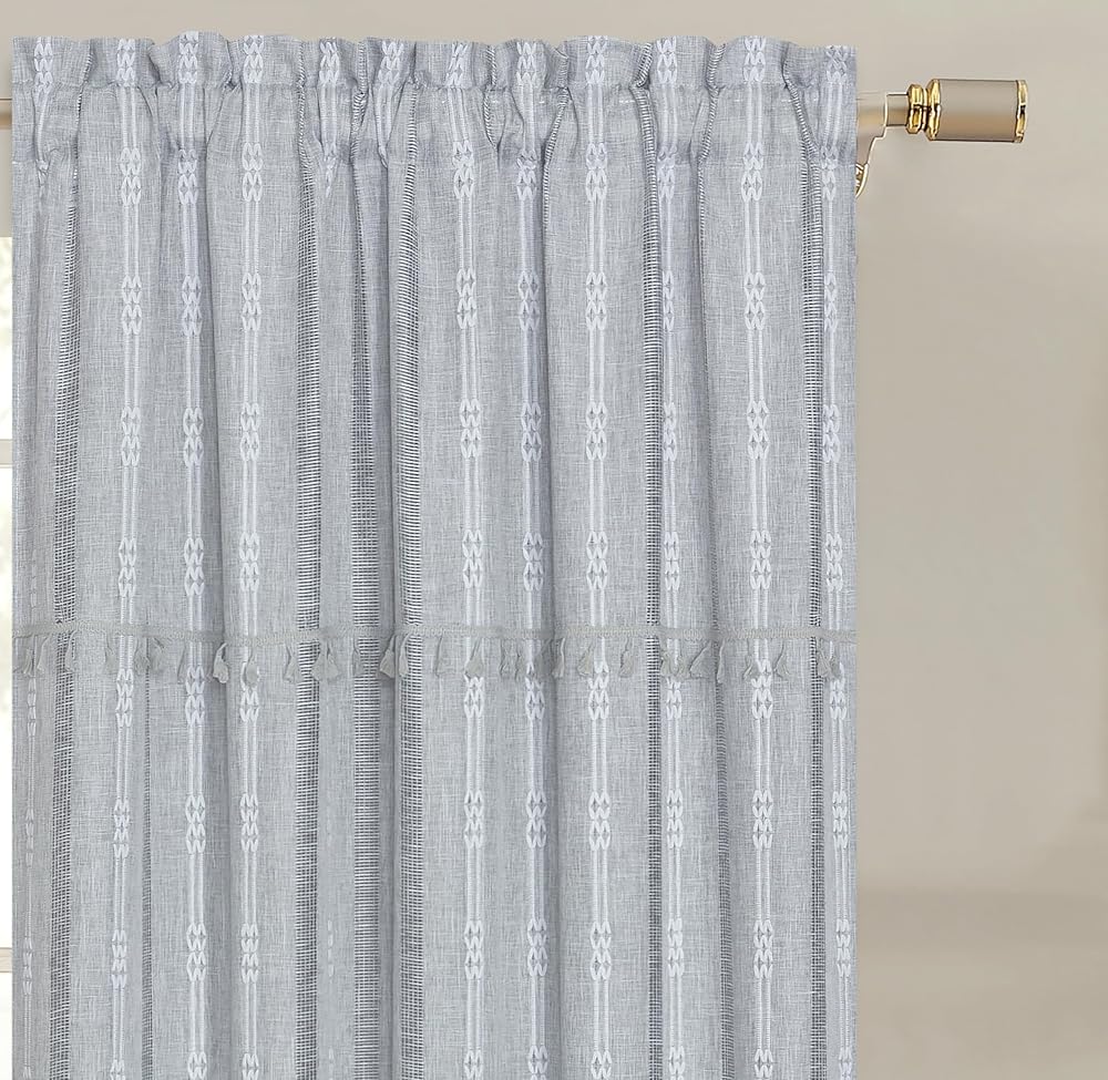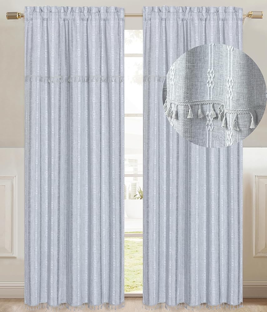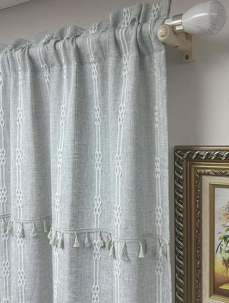 【ستائر بوهو】تتميز ستائر النافذة بتصميم بوهيمي مع شرابات بوهيمية وملمس مخطط مطرز. إنها تتناسب تمامًا مع ديكور غرفة المزرعة الحديثة أو غرفة ذات طراز بوهيمي، مما يضيف سحرًا إلى منزلك.
