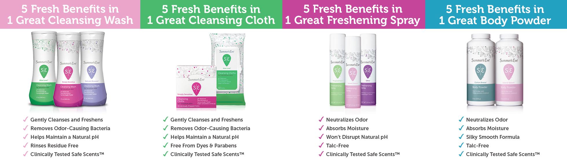 Because there are lots of reasons you want to feel fresh and clean, there's Summer's Eve. Use Summer's Eve cleansing washes daily for general cleansing. You can also use Summer's Eve cloths, powder and freshening spray to refresh after a workout, before getting intimate, or anytime you'd like to feel fresh and clean.