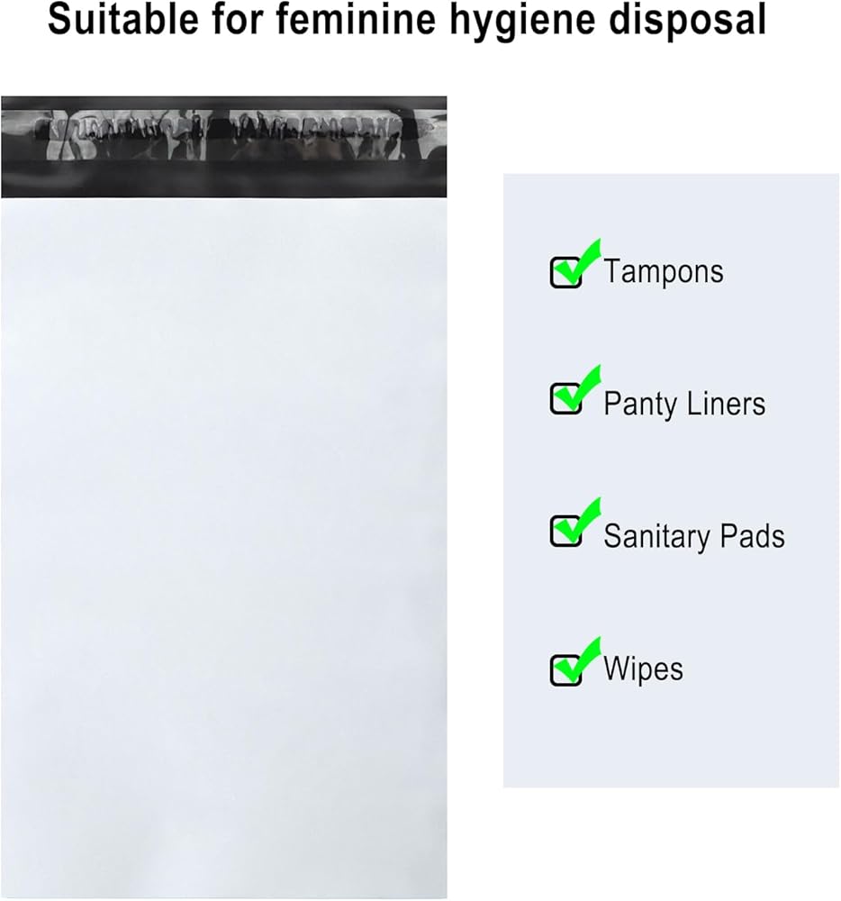 إخفاء الأغراض الشخصية: تم تصميم الحقائب النسائية التي تستخدم لمرة واحدة خصيصًا للنساء، وهي رائعة للتخلص من السدادات القطنية، وبطانات اللباس الداخلي، والفوط والمناديل المبللة. أكياس التخلص من المناديل الصحية غير شفافة ولا أحد يعرف ما بداخلها، مما يحمي خصوصيتك