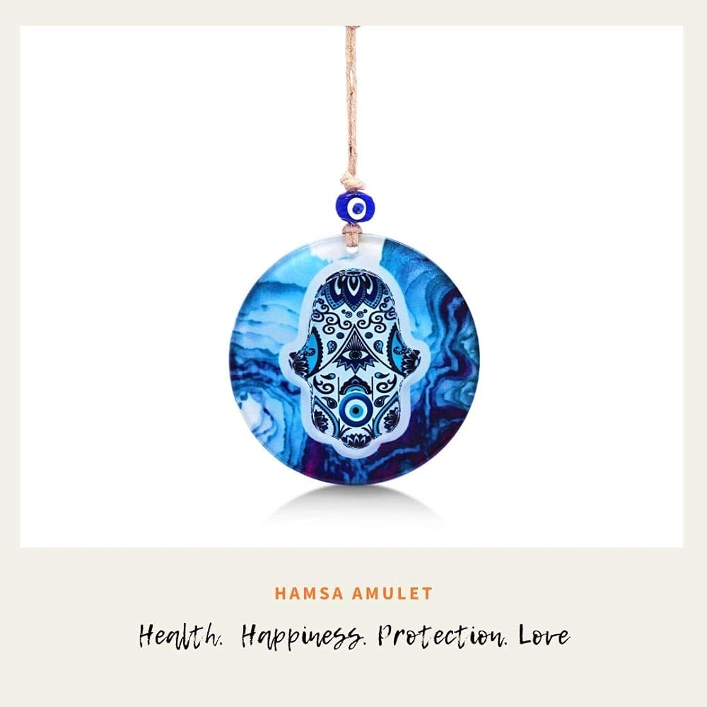 ديكور جدار منزلي من الزجاج الأزرق من همسة مع تميمة عين شريرة للحماية، وبركات وفيرة، وصحة جيدة وازدهار - تأتي في صندوق هدايا للتدفئة بالمنزل الجديد، والمضيفة