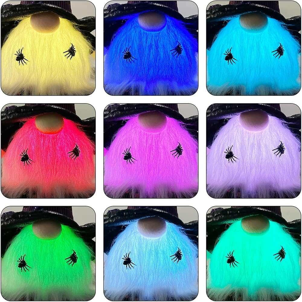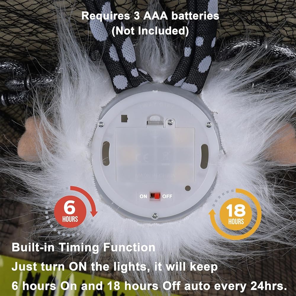 مؤقت وتغيير لون RGB: وظيفة توقيت مدمجة، فقط قم بتشغيل الأضواء، وسوف تبقى 6 ساعات قيد التشغيل و18 ساعة إيقاف تلقائي كل 24 ساعة. يوجد ضوء LED متغير اللون RGB على بطونهم المستديرة. عند تشغيل المفتاح، يتغير لون الضوء تلقائيًا، وينبعث مزاجًا مرعبًا، مما يخلق جوًا مرعبًا. تعمل بـ 3 بطاريات AAA، غير متضمنة البطاريات