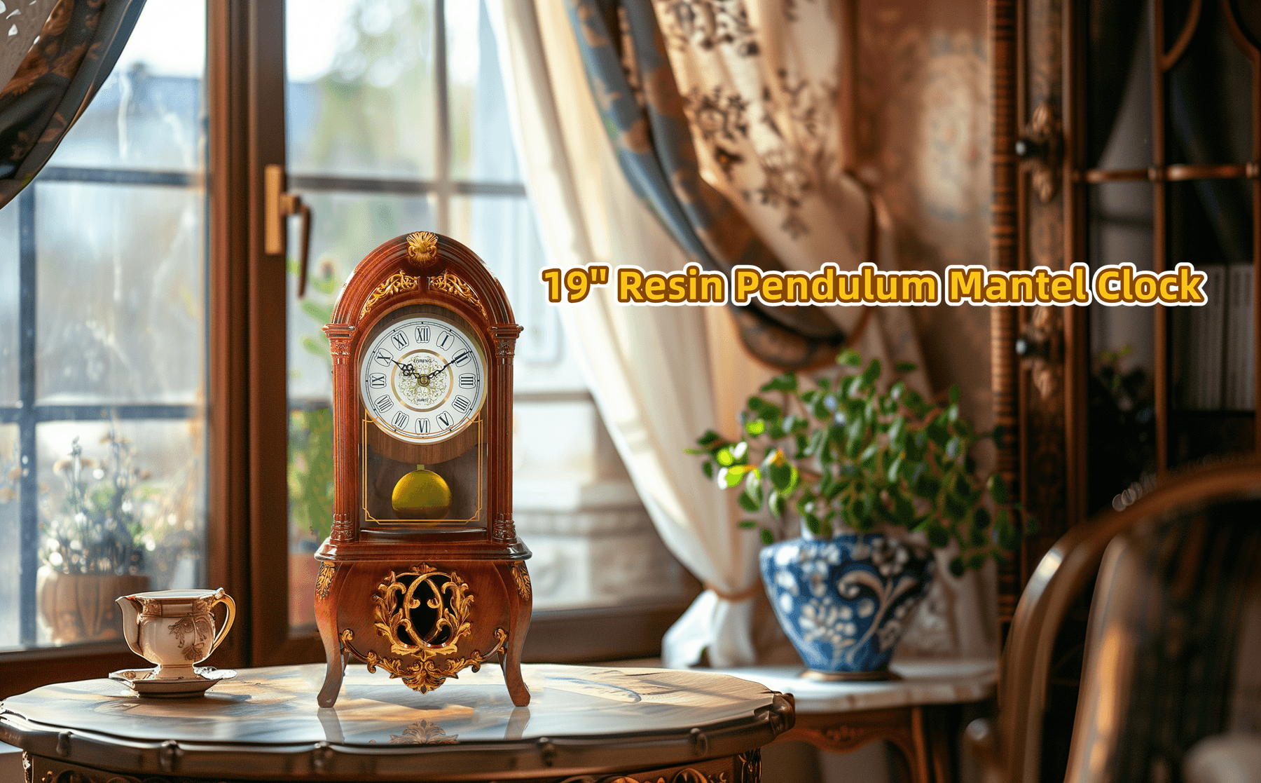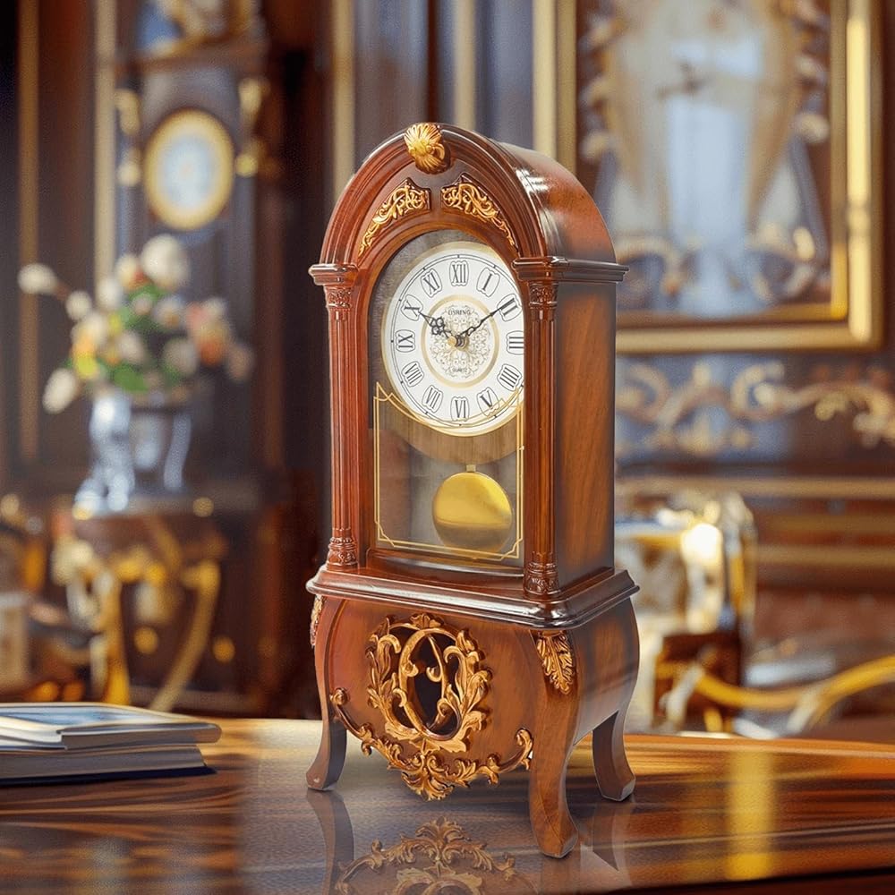 تصميم قديم: تتميز ساعة رف الطاولة ذات الطراز العتيق بلمسة نهائية تشبه الخشب مصنوعة من الراتنج عالي الجودة، وتعرض تفاصيل ذهبية معقدة وقمة مقوسة بأناقة. الحجم: 9*4.5*19 بوصة، 5 رطل