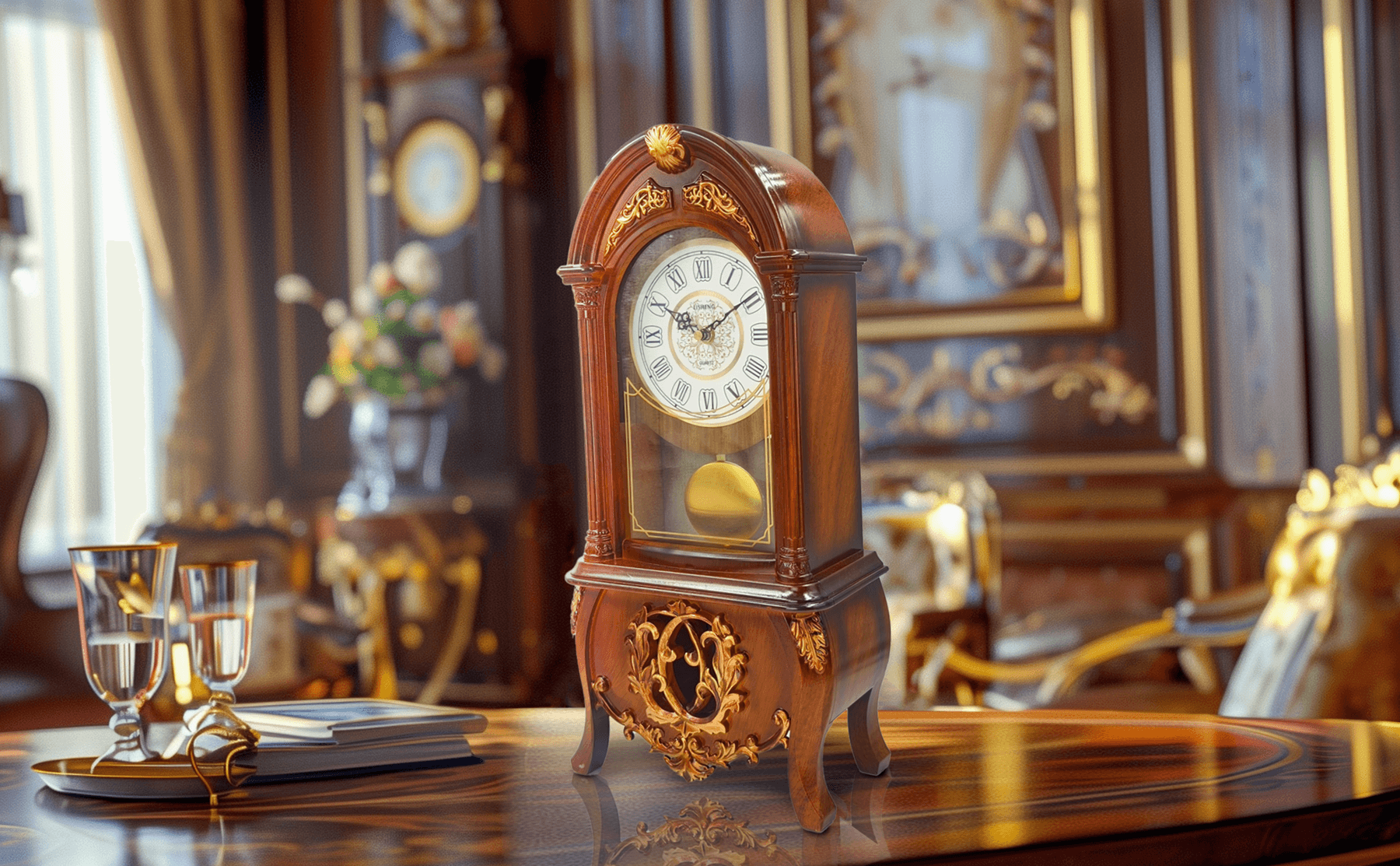 هيكل ثابت: تجمع هذه الساعة بين الثبات والمظهر المرتفع. تسلط المنحوتات المعقدة واللمسات الذهبية في جميع أنحاء الإطار الضوء على أسلوبها الفاخر والمتطور.