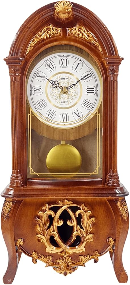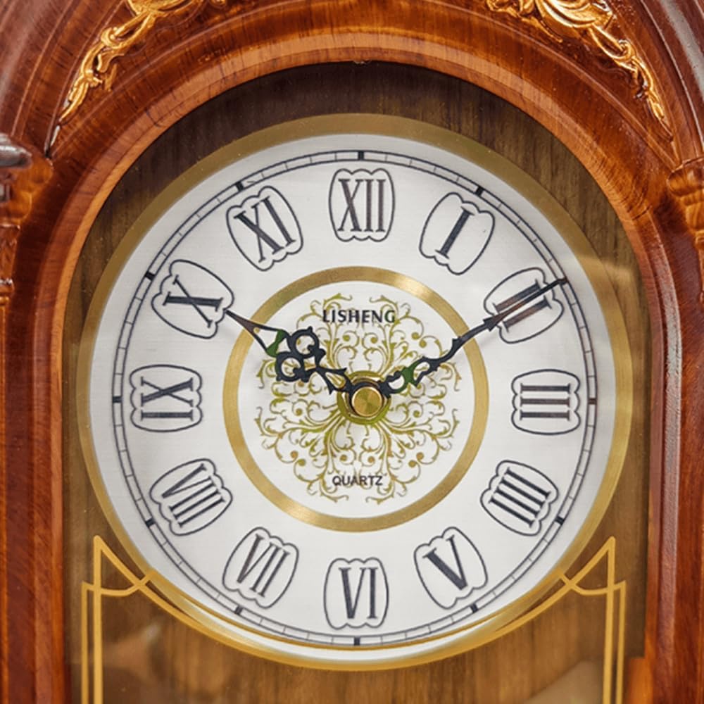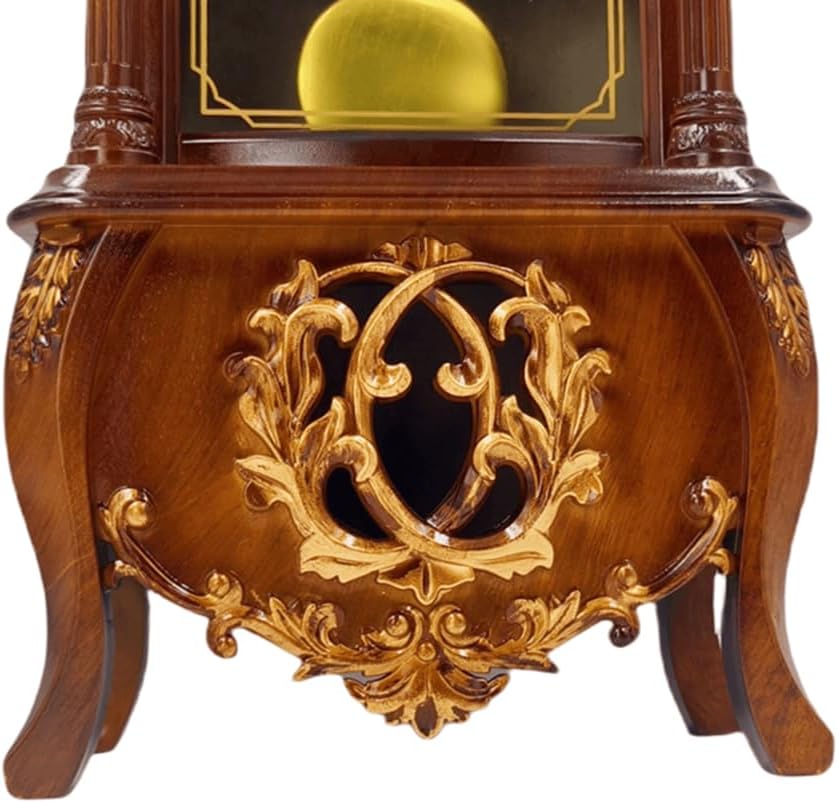 بندول وظيفي: تتميز الساعة ببندول ذهبي مرئي داخل نافذة زجاجية، مما يضيف عنصرًا ديناميكيًا تقليديًا لتصميمها ويعزز جاذبيتها كساعة عملية وقطعة زخرفية.