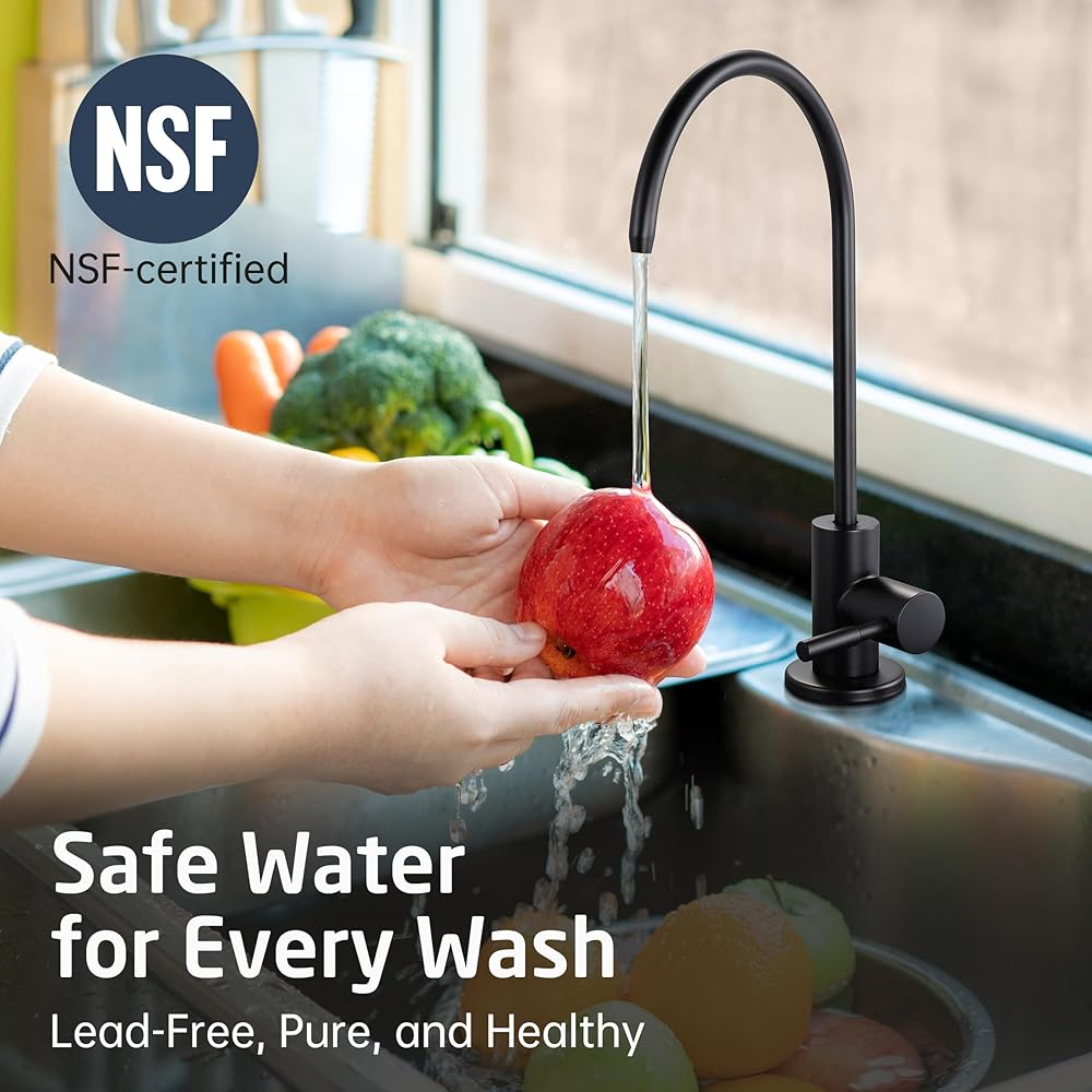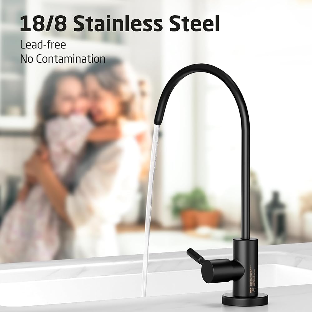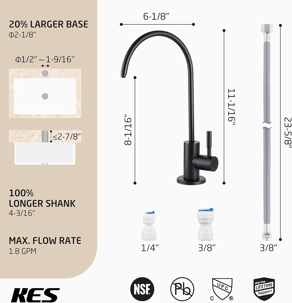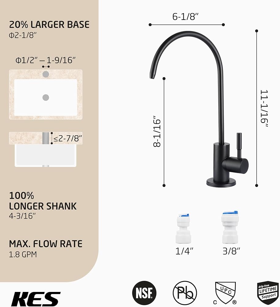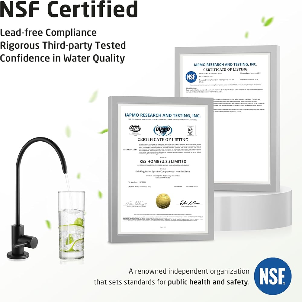• معتمد من cUPC NSF: صنبور التناضح العكسي KES يلبي معايير الجودة العالية في الولايات المتحدة وكندا (رمز السباكة الموحد)، معتمد من IAPMO. جسم الصنبور مصنوع من الفولاذ المقاوم للصدأ عالي الجودة الخالي من الرصاص (مع أقل من 0.25% من محتوى الرصاص)، ومتوافق مع تنظيم NSF/AB1953 الخالي من الرصاص، وهو آمن لمياه الشرب. إنها أكثر مقاومة للحرارة والضغط العاليين، وأكثر متانة وتحملًا من الحنفيات المصنوعة من سبائك الزنك، لذلك يمكن أن تدوم لسنوات عديدة دون تسريب.