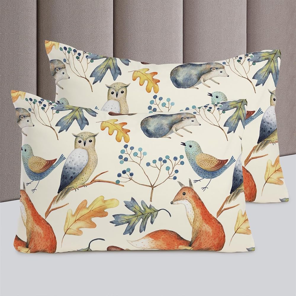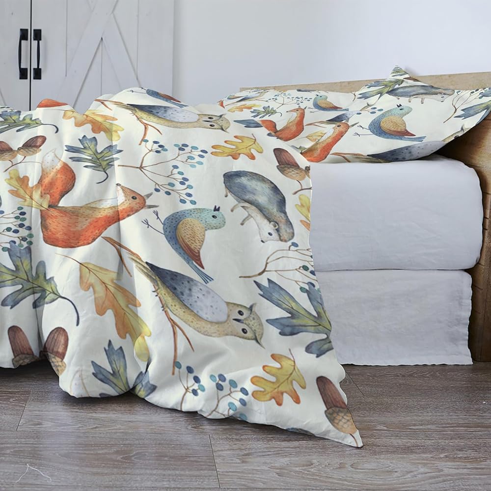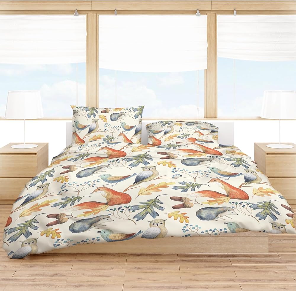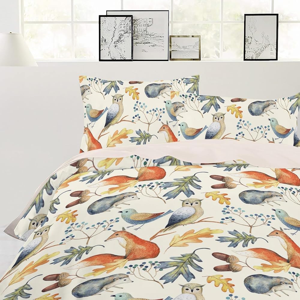 طقم لحاف مناسب لجميع المواسم، مجموعة أغطية لحاف طيور الخريف فائقة النعومة من 3 قطع، إغلاق بسحاب لفراش الأطفال الصغار، خريف البومة، طائر الثعلب، برتقالي مخضر نباتي (حجم مزدوج)
