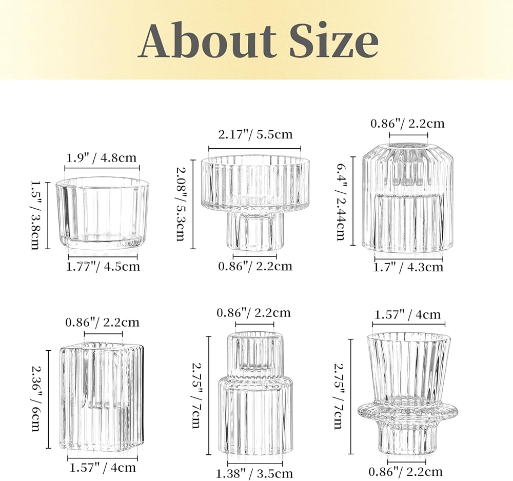 【أحجام مختلفة】يوجد 6 حوامل شموع نذرية مختلفة الأنماط في العبوة. حامل الشموع الشفاف متعدد الاستخدامات، مصنوع ليناسب المستدق وأضواء الشاي والشموع النذورة بأقطار من 0.86 بوصة إلى 2 بوصة.