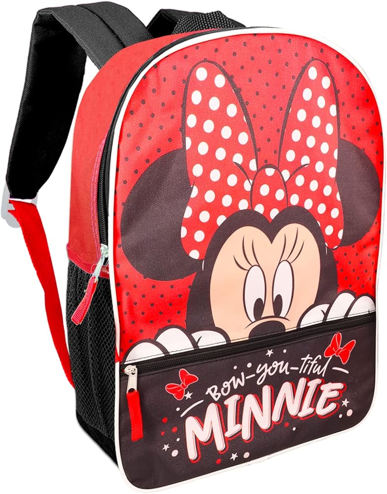 Minnie Mouse Backpack Set - Bundle with 16” Minnie Backpack for Girls 4-6, Water Bottle, Stickers, More | Minnie Mouse School Backpack. This Minnie Mouse backpack for girls set includes a 16” Minnie Mouse backpack depicting colorful artwork of Minnie with padded adjustable shoulder straps and top loop for hanging. Made of durable material, this Minnie Mouse school backpack is sure to last and will carry everything you need with you no matter where you go. Sure to be a hit with Minnie Mouse fans of all ages, this Minnie school backpack for girls can double as a travel bag, storage container, and more! This Minnie kids backpack pairs perfectly with all other Minnie Mouse merchandise. Officially licensed Minnie Mouse backpack for girls custom product bundle also includes a Beach Kids pink water bottle, Minnie stickers, and a princess castle door hanger
