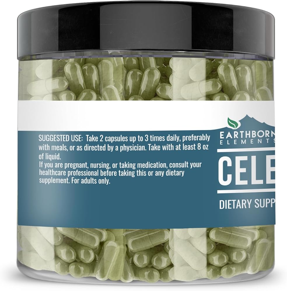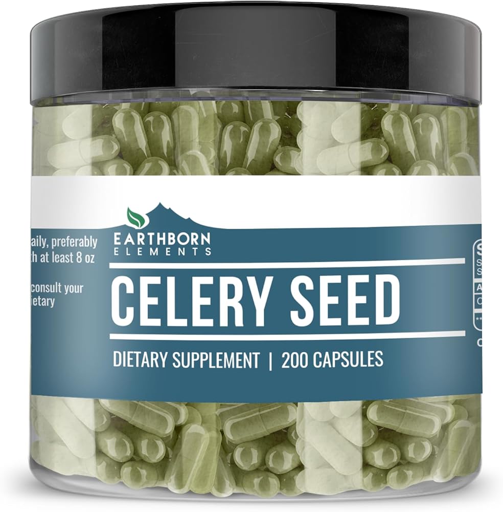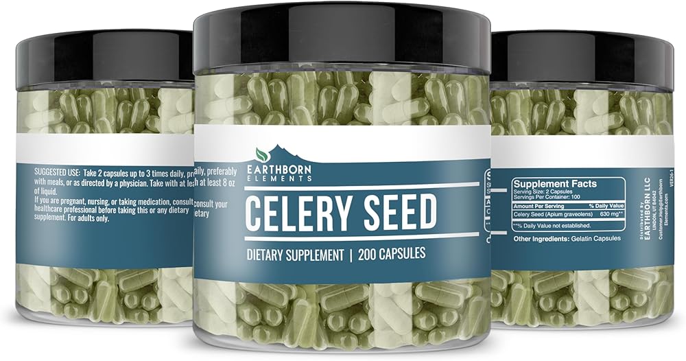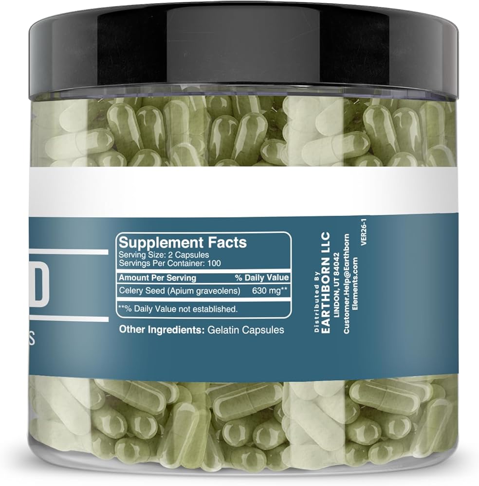 • Earthborn Elements 200 Celery Seed Capsules in a resealable plastic container