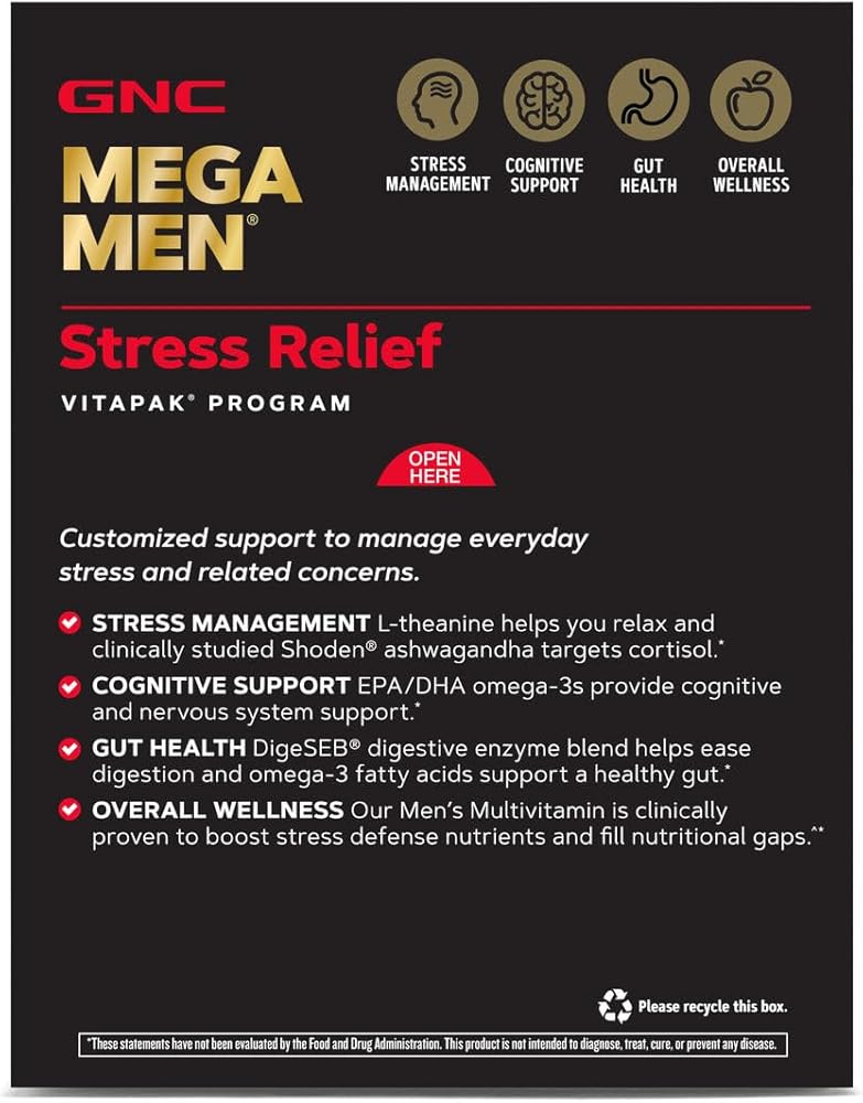 • ابدأ في تخفيف التوتر بالفيتامينات والمزيد: يؤثر الإجهاد على كل نظام في الجسم - لذلك يعمل برنامج GNC Mega Men Stress Relief Vitapak على توفير العناصر الغذائية الشاملة بالإضافة إلى الدعم المدعوم علميًا للإجهاد.