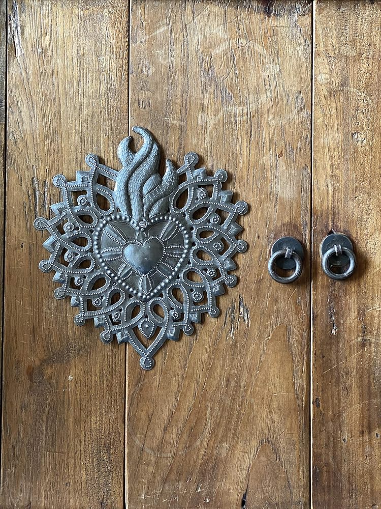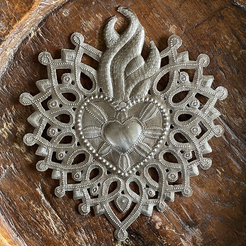 قلب مقدس، ميلاغرو مزخرف صغير، قلب ملتهب، مصنوع يدويًا من براميل الزيت المعاد تدويرها، لوحة فنية جدارية معدنية هايتية مقاس 7 × 8 بوصات