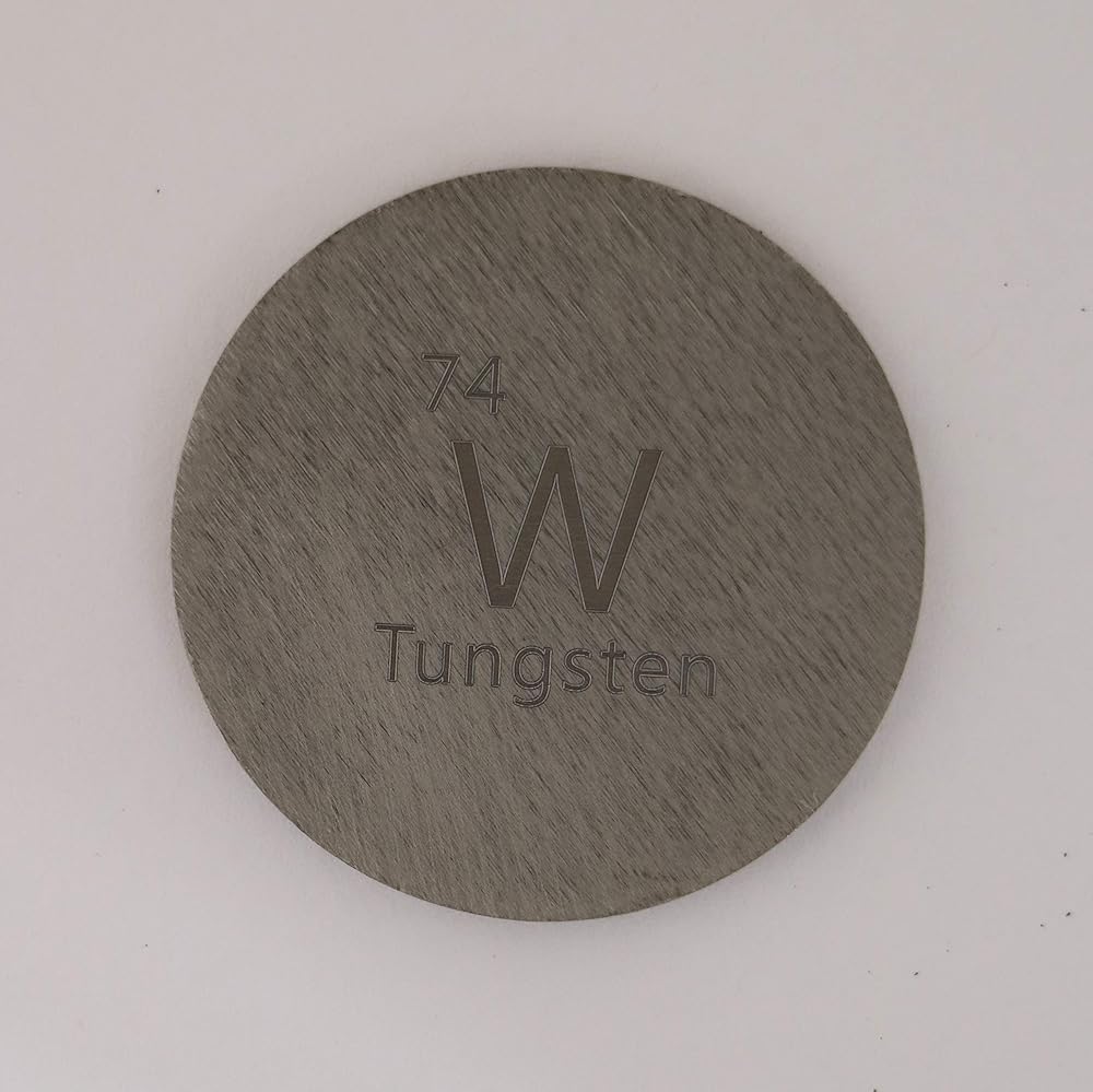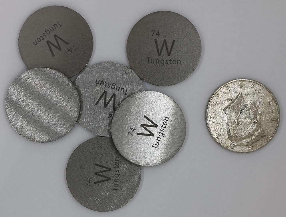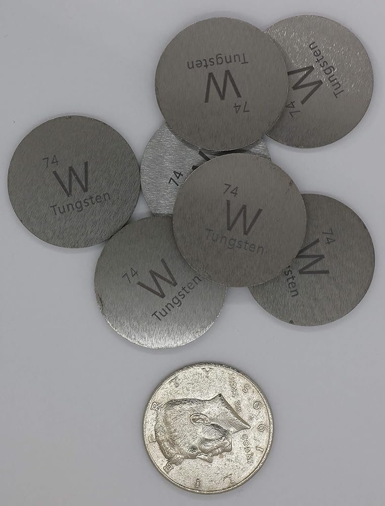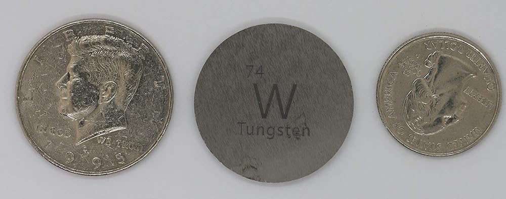 Tungsten is a chemical element with symbol W and atomic number 74. Tungsten is a rare metal found naturally on Earth almost exclusively combined with other elements in chemical compounds rather than alone. In its raw form, tungsten is a hard steel-grey metal that is often brittle and hard to work. If made very pure, tungsten retains its hardness (which exceeds that of many steels), and becomes malleable enough that it can be worked easily. -Wikipedia Half Dollar and Quarter not included