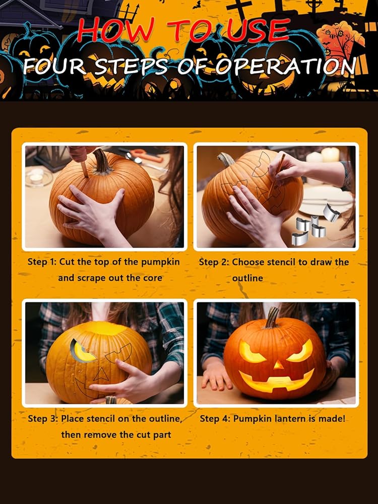 【Strong Sturdy】 Pumpkin Stencils for carving is made of food-grade stainless steel, which is durable, not easily damaged, can be reused many times, and is easy to clean. After use, just rinse with water and wipe with a rag.