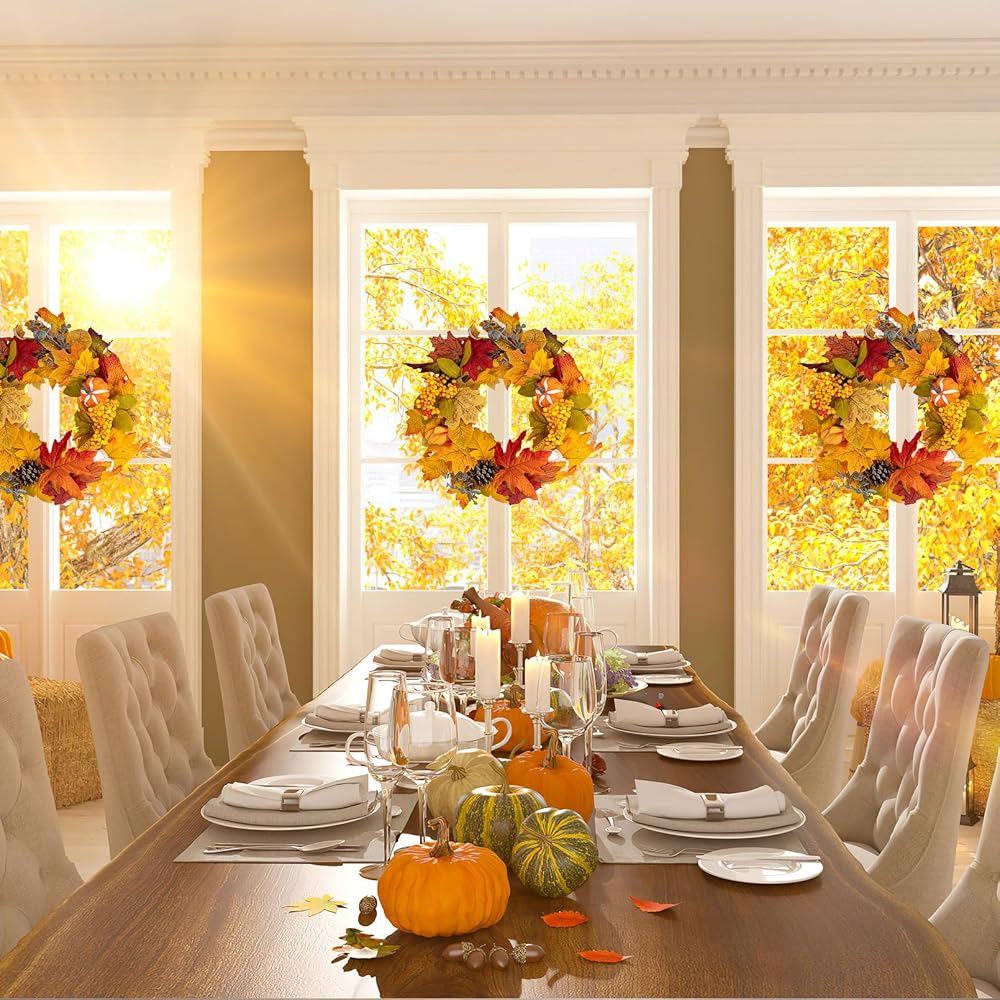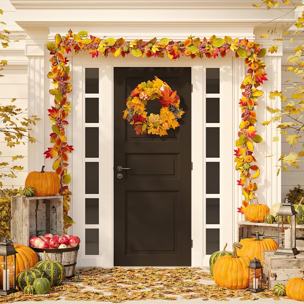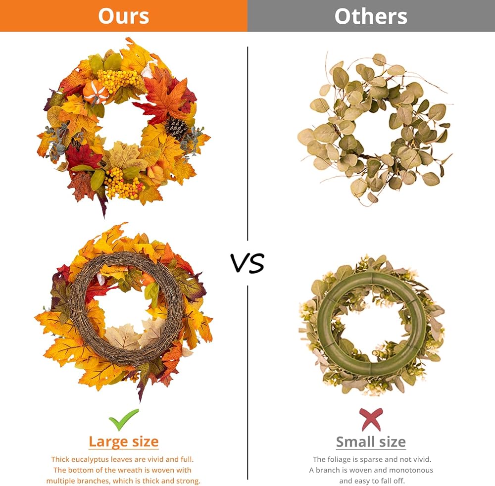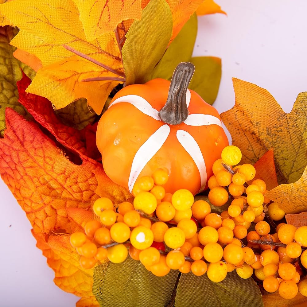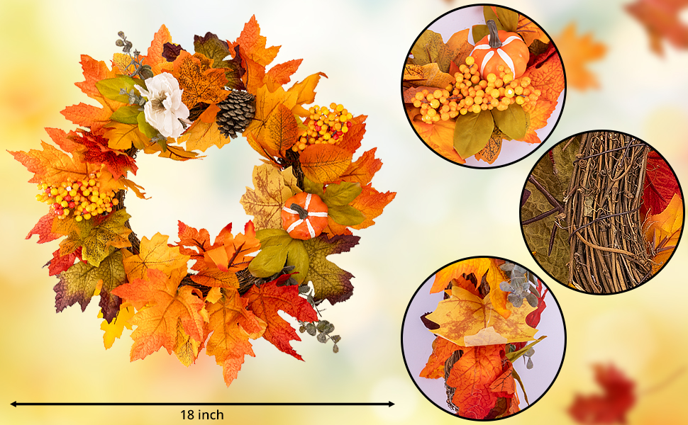 زخرفة متعددة الاستخدامات: هذا الإكليل لا يقتصر على مناسبة واحدة، فهو ديكور متعدد الاستخدامات. يمكن استخدامه في عيد الشكر والهالوين ومهرجانات الحصاد وحتى عيد الميلاد. كما يمكن تعليقه على الحائط، والباب الأمامي، والشرفة، وغرفة النوم، وغرفة المعيشة، وما إلى ذلك. إكليلنا يلبي الاحتياجات الجمالية لأي مشهد.