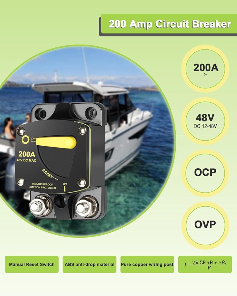 قاطع دائرة 200 أمبير، تيار مستمر 12 فولت - 48 فولت، مصهر مع مفتاح إعادة الضبط اليدوي لسيارة RV، صوت السيارة البحرية، محرك التصيد، بطارية صوت ستيريو، النظام الشمسي مع OCP OVP