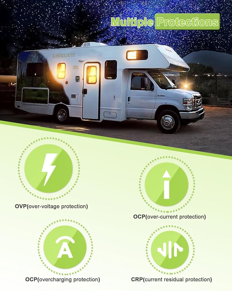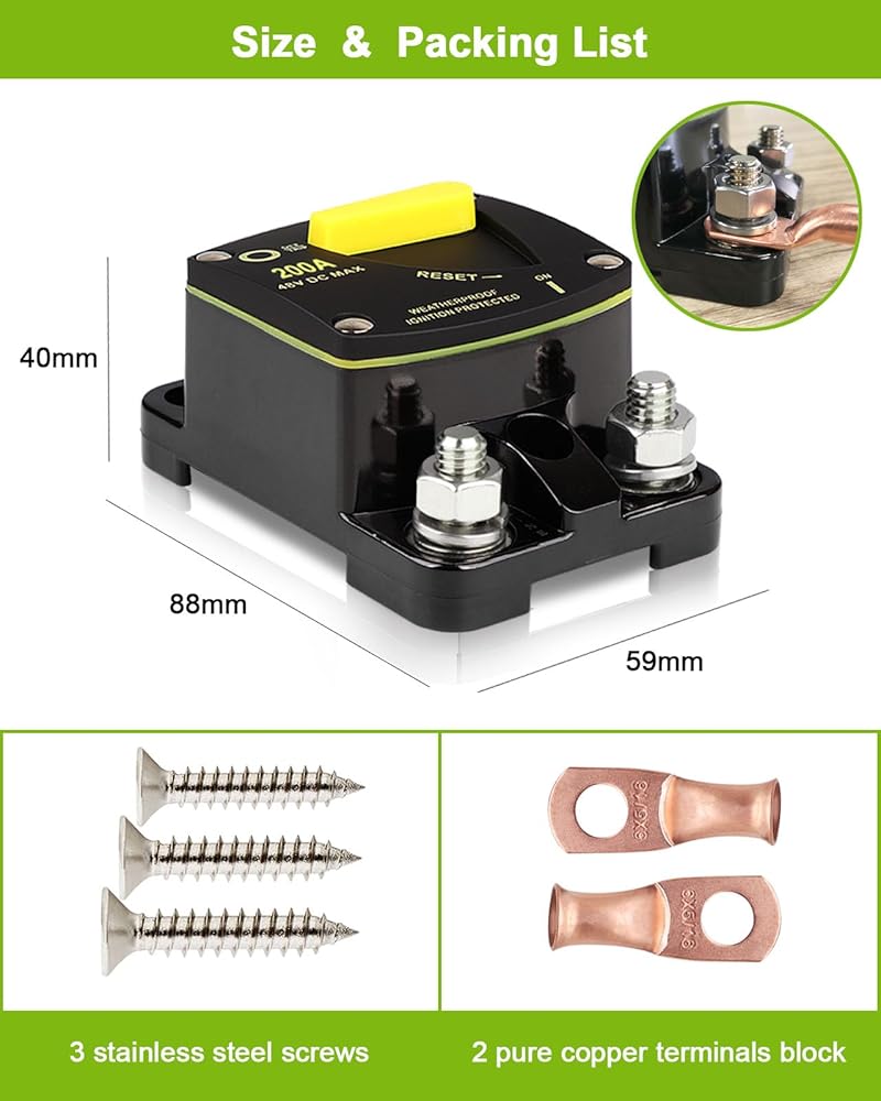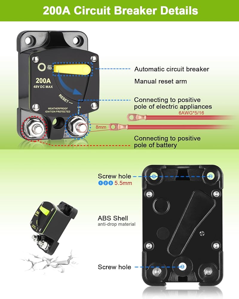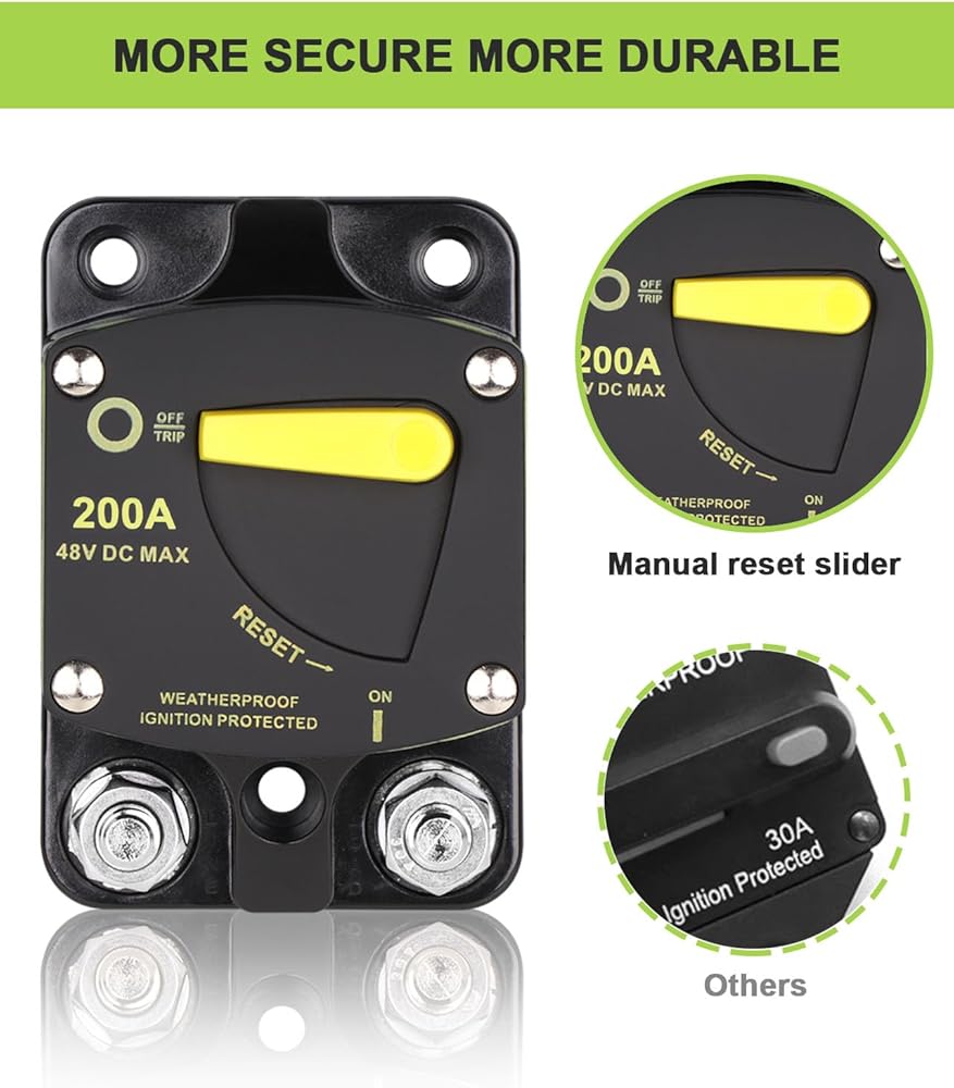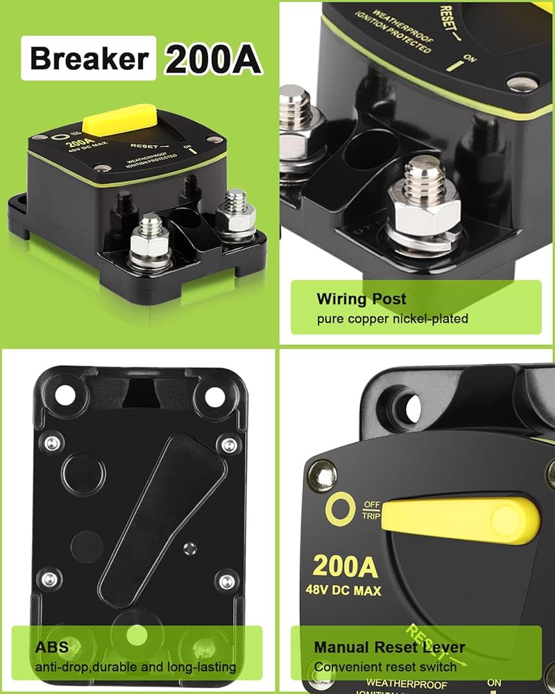 قاطع الدائرة DC 200A: يحتوي قاطع الدائرة على مفتاح زر إعادة الضبط اليدوي، والذي يمكنه التحكم بسهولة في انقطاع الدائرة، أي ما يعادل فعالية المصهر، ويحمي بشكل فعال الأجهزة الكهربائية للسيارة، مع حماية من التيار الزائد، وحماية من الجهد الزائد، والتيار الحماية المتبقية وحماية الشحن الزائد.