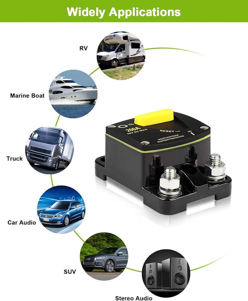 تطبيقات على نطاق واسع: يمكن أن تعمل قواطع الدائرة على حماية المعدات الكهربائية والأسلاك. ويمكن استخدامها في ستريو السيارة، والمركبات الترفيهية، والشاحنات، والقوارب البحرية، ومحركات التصيد، والصوتيات الاستريو، وشواحن البطاريات، والأنظمة الشمسية، وأنظمة الصوت DC، إلخ.