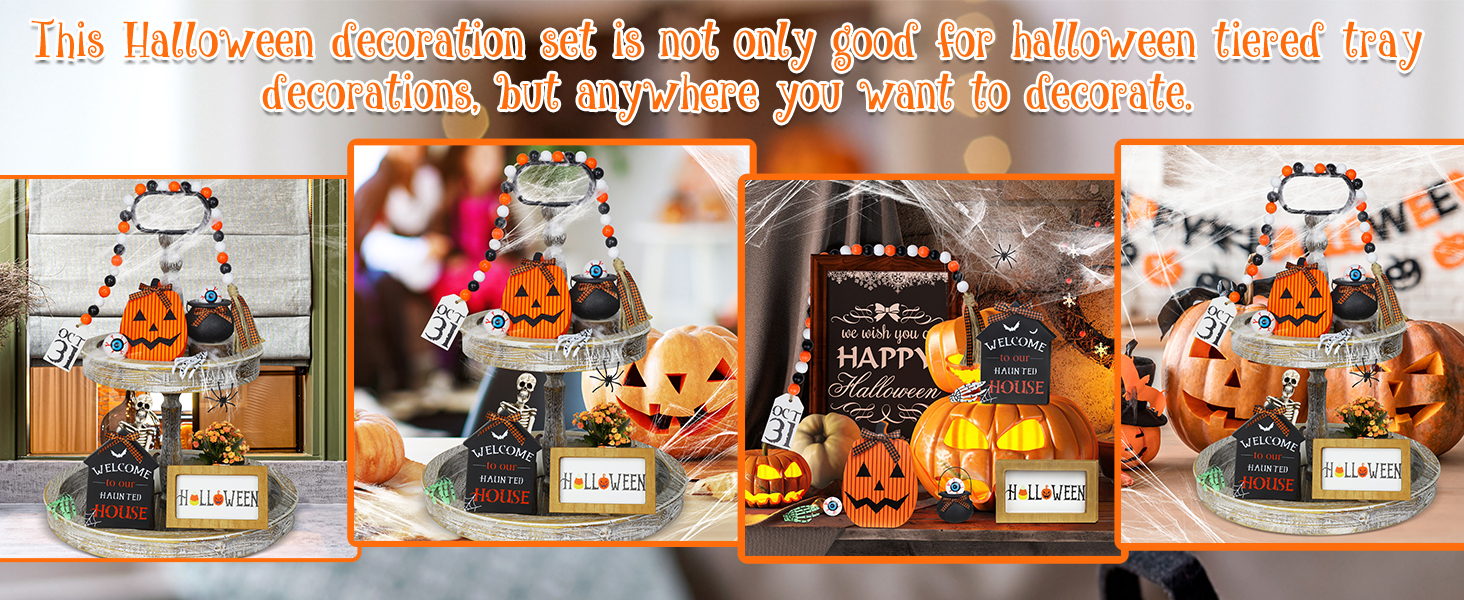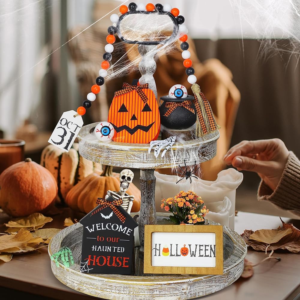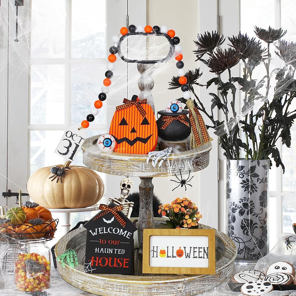 ديكورات الهالوين في الأماكن المغلقة - مجموعة ديكورات الهالوين هذه ليست فقط لتزيين صينية الهالوين ذات الطبقات ولكن أيضًا للطاولة والمطبخ والغرفة والرف والرف والمدفأة وفي أي مكان تريد تزيينه. سيكون هذا ديكورًا جيدًا للهالوين للمنزل.