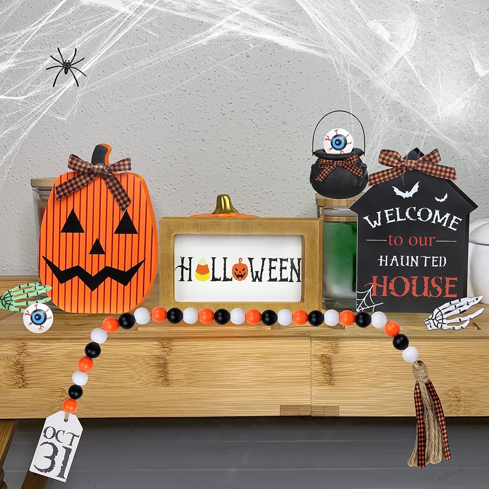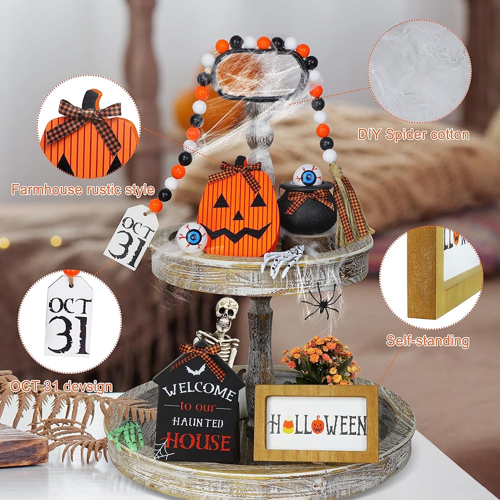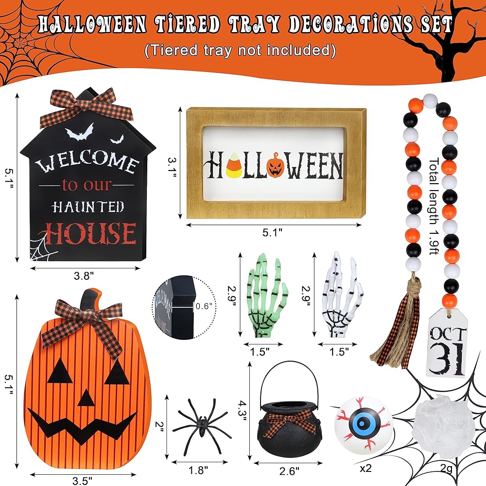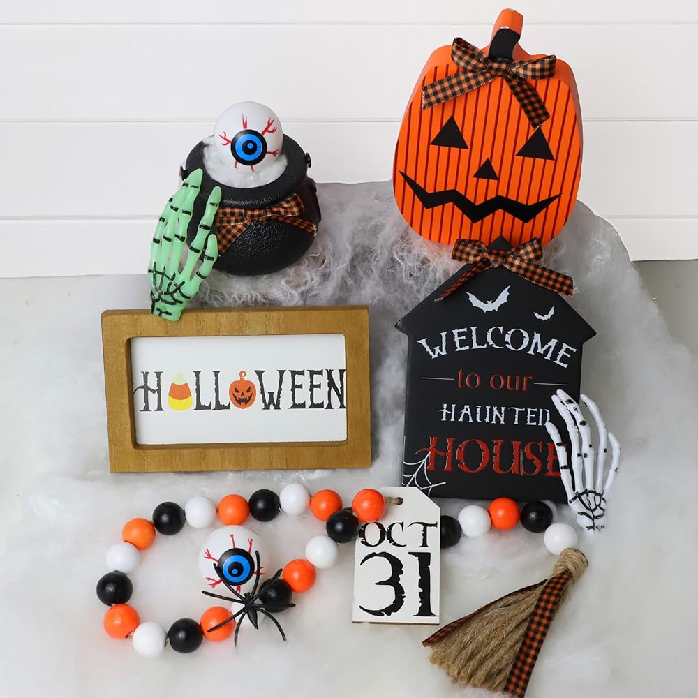 مجموعة ديكورات صينية الهالوين ذات الطبقات - تتضمن المجموعة 3 أنماط مختلفة من لافتات الهالوين الخشبية (علامة الهالوين*1، علامة اليقطين*1، لافتة البيت المسكون*1) + إكليل من الخرز الخشبي مع علامة OCT 31 *1 + مقلة العين *2 + مرجل الساحرة *1 + عنكبوت صغير*1 + ذراع هيكل عظمي *2 (أخضر وأبيض) وشبكة عنكبوت 2 جرام. يرجى عدم: الدرج ذو الطبقات غير متضمن.
