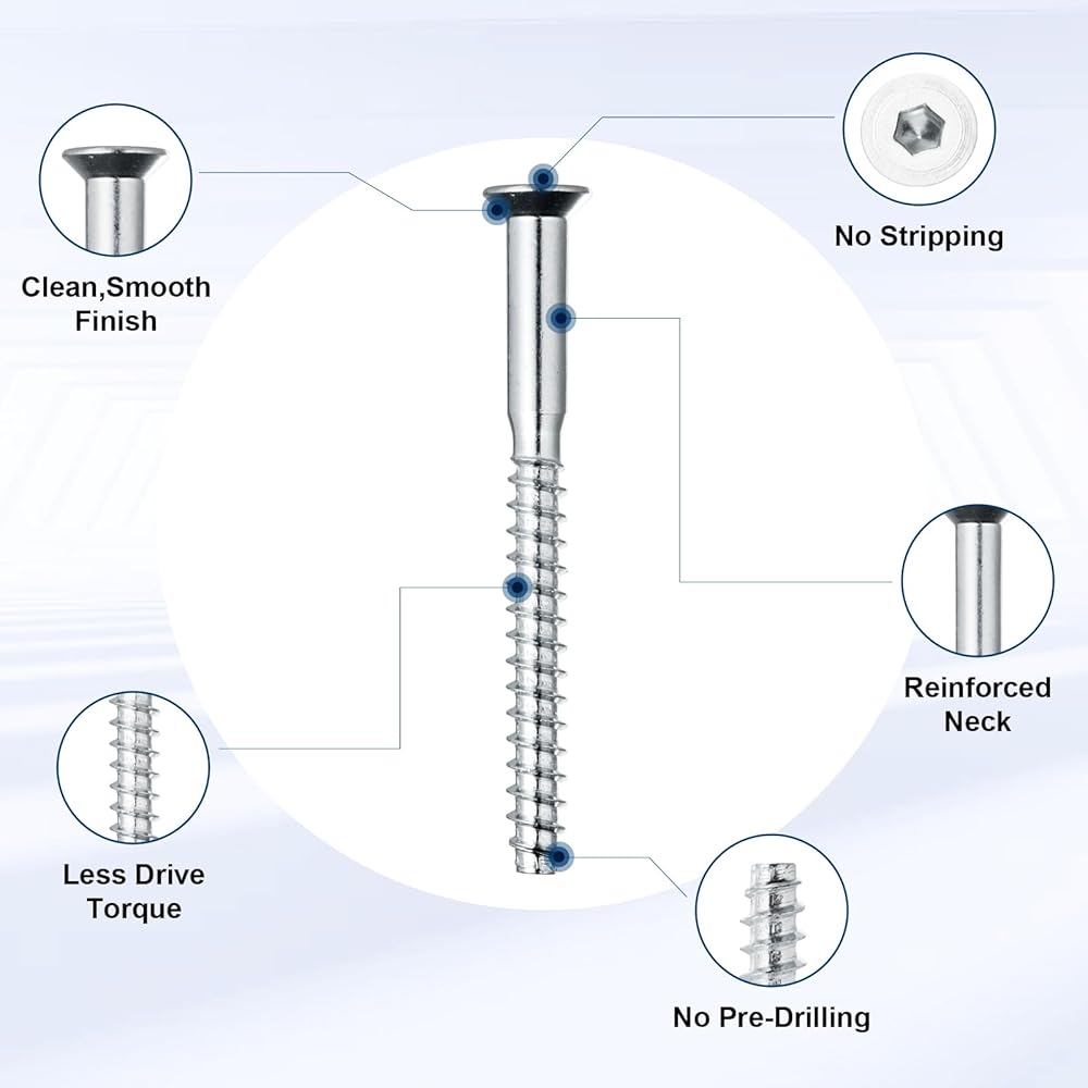 محرك مقبس سداسي: تتميز هذه البراغي بمحرك مقبس سداسي، مما يضمن التركيب السهل والسريع باستخدام مفتاح ألين. تسهيل الأعمال الخشبية الفعالة وتوفير الوقت. أنت بحاجة إلى إعداد لقمة مثقاب متدرجة، والتي تصنع ثقبًا بالأبعاد المناسبة للأجزاء الملولبة وغير الملولبة من المسمار، بالإضافة إلى غمر فتحة رأس المسمار بشكل عكسي.