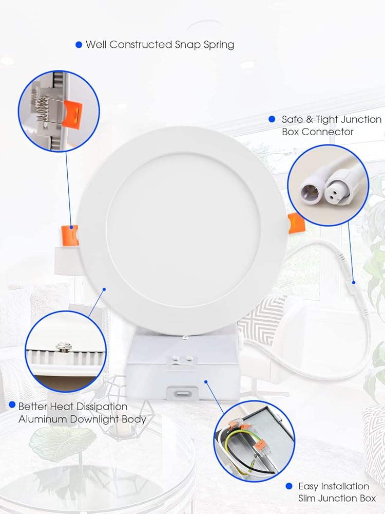 الميزات: هذا الضوء راحة LED بدون علبة مقاس 6 بوصة غير وميض، يعتم بسلاسة 5%-100%، متوافق مع معظم المخفتات في السوق. CRI 80+، ضوء نهاري 5000 كلفن، ما يعادل 120 وات مع 12 وات فقط لتوفير ما يصل إلى 86% من فاتورة الطاقة الخاصة بك