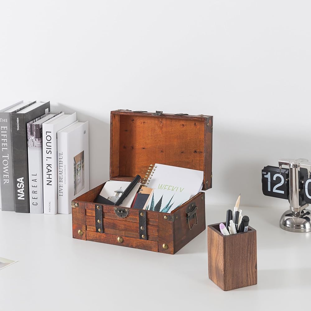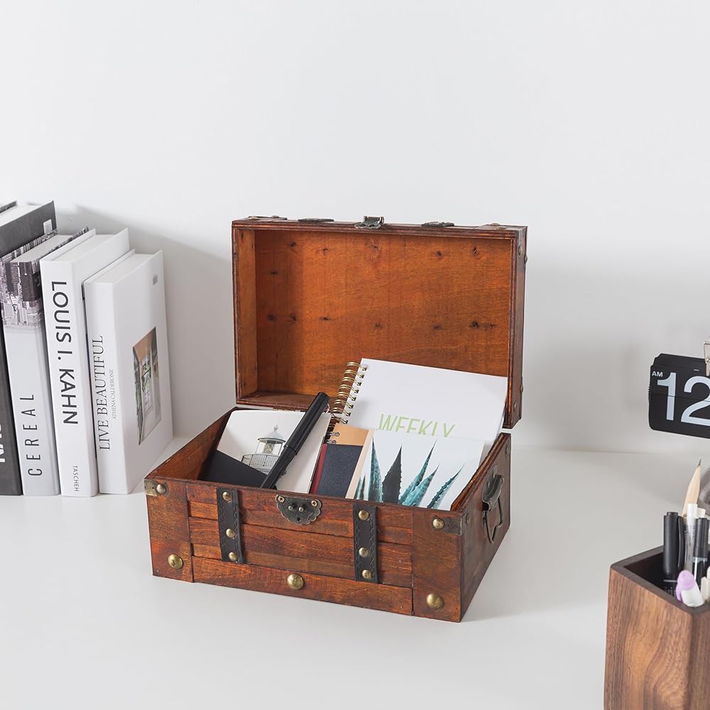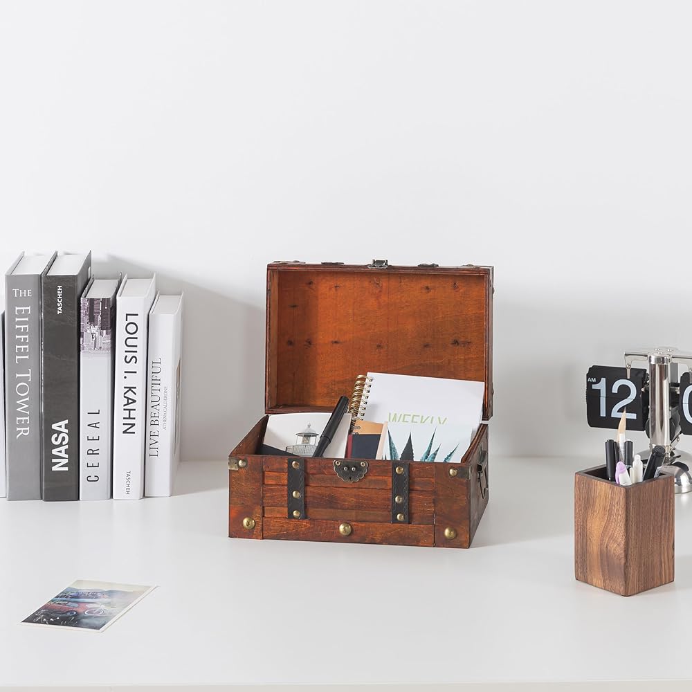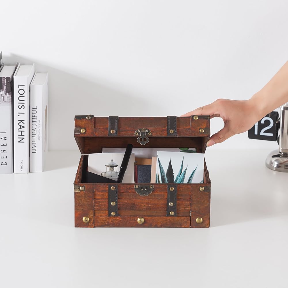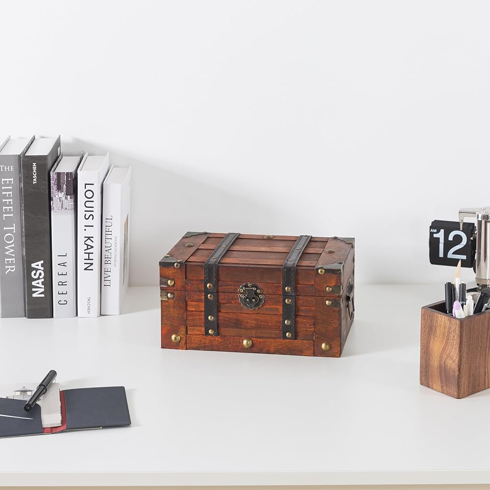 Enhance your home with this small wooden treasure chest, a vintage-style wooden trunk that adds visual interest and practical storage to any space. Crafted with durable plywood and adorned with decorative straps and antique-style hardware, this charming chest is ideal for any office, den, or living area. It's perfect for containing remotes on a glass coffee table or storing office essentials like printer ink and mobile chargers on a shelf.