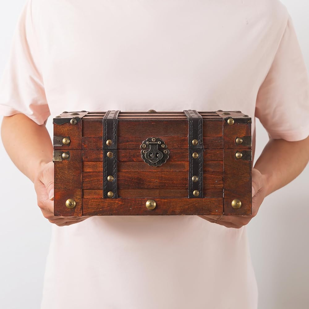 The trunk's compact size of 11 inches x 7 inches x 5.5 inches makes it an ideal catch-all for dressers or console tables in entryways or bedrooms. Whether used as a focal point in your decor or as practical storage, this wooden chest combines timeless design with everyday utility.