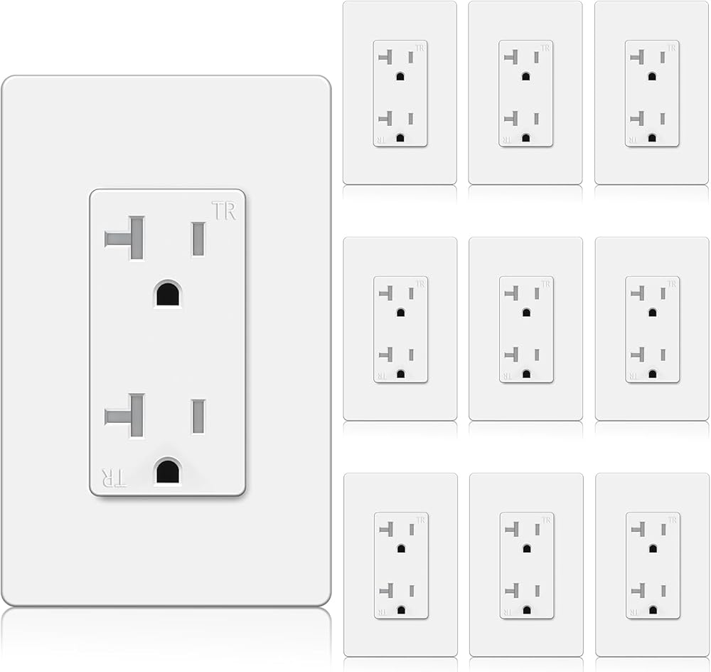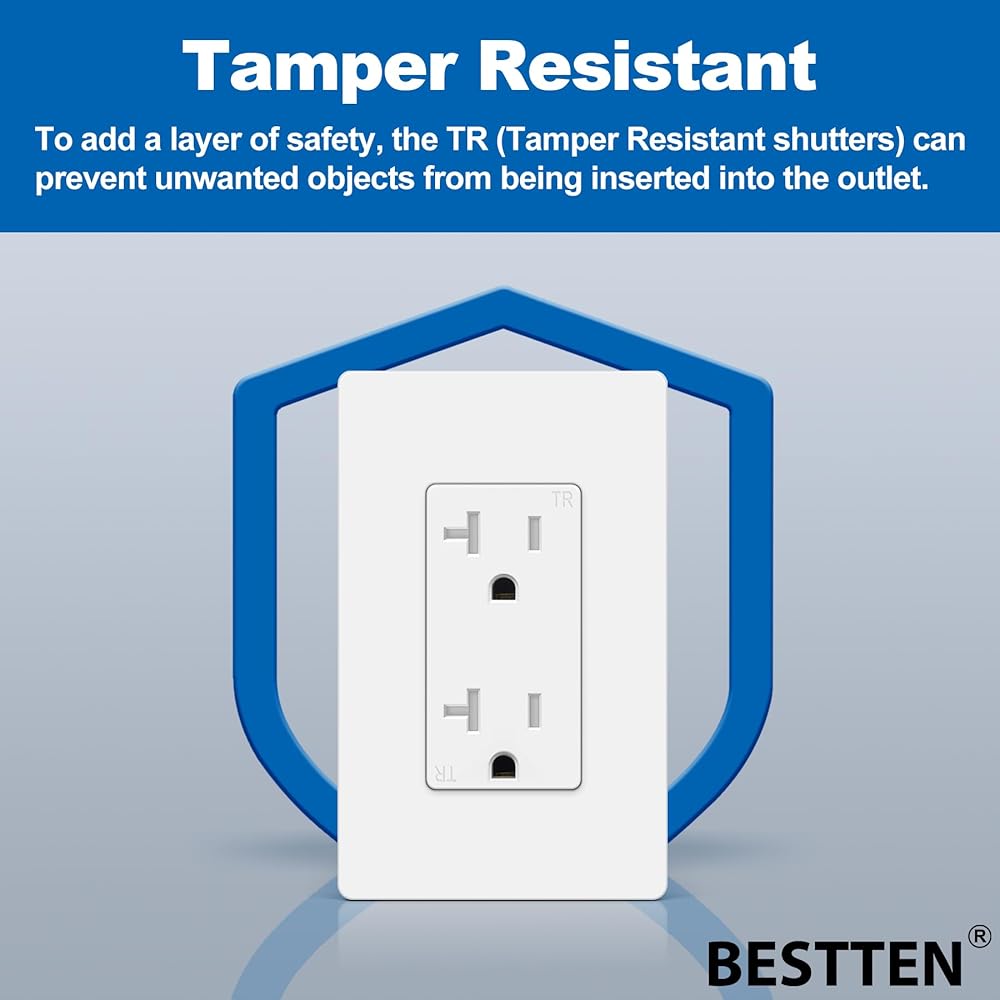 BESTTEN 10 عبوات من منافذ مقابس 20 أمبير مع مقاومة للعبث، لوحة حائط بدون براغي، مدرجة في قائمة UL، أبيض