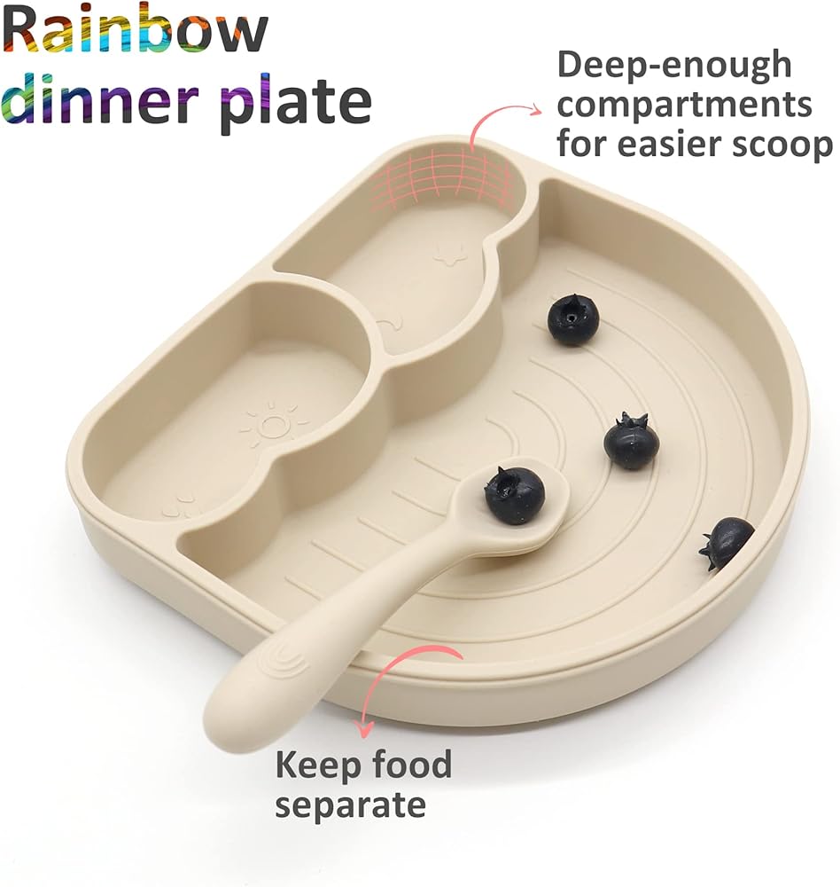 【طبق مقسم بألوان قوس قزح】أحجام مثالية مع 3 أقسام مقسمة للأطعمة المختلفة. تتيح لك الأقسام المقسمة علميًا ترتيب الأطعمة المختلفة لنظام غذائي متوازن لطفلك. شفط قوي للغاية يمنع الرمي والقذف. يساعد على منع الفوضى والانسكابات أثناء ممارسة طفلك الصغير للتغذية الذاتية.