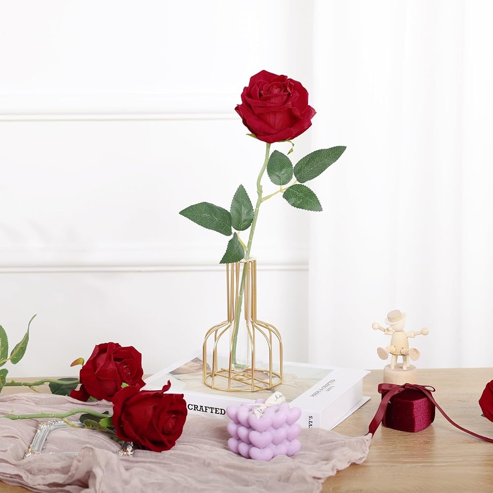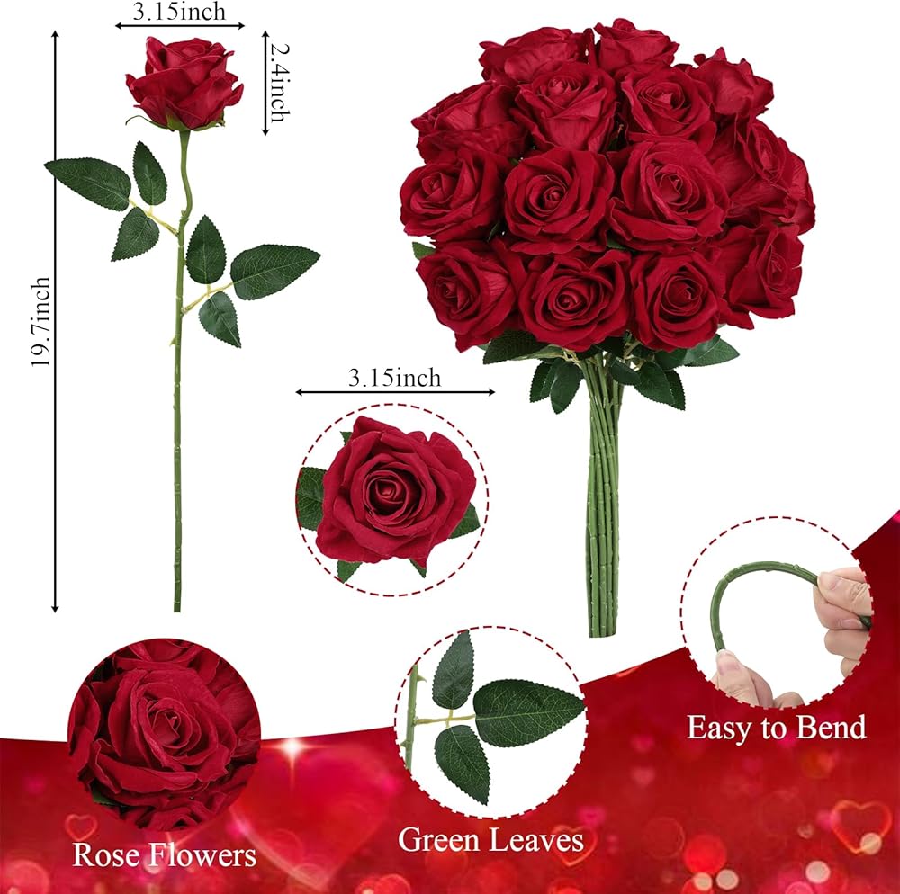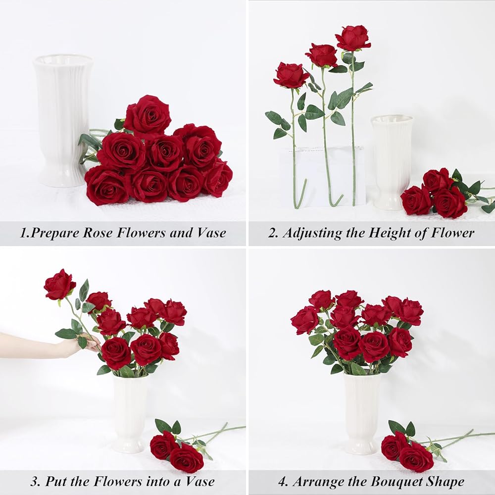 خامة فاخرة: الزهور الصناعية الحمراء مصنوعة من الحرير والبلاستيك وسلك معدني عالي الجودة، ويمكن ثنيها بحرية وتعديلها أيضًا في الارتفاع والشكل.