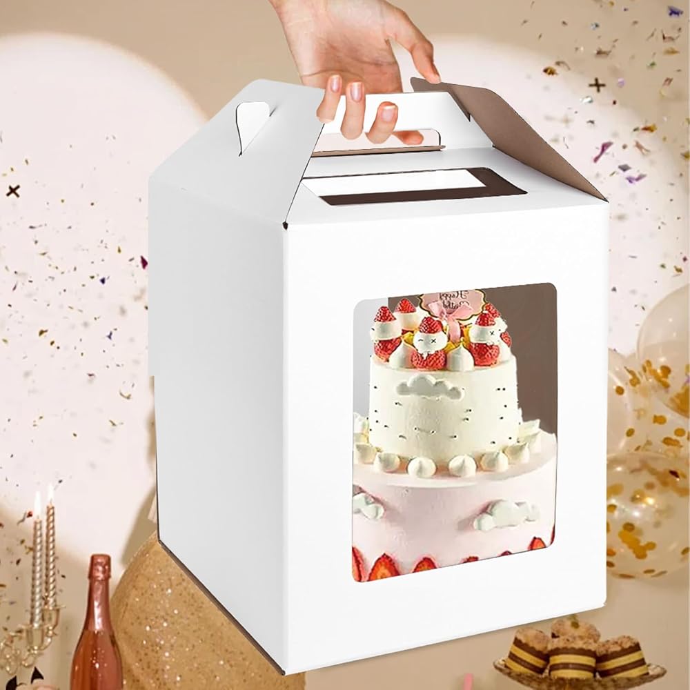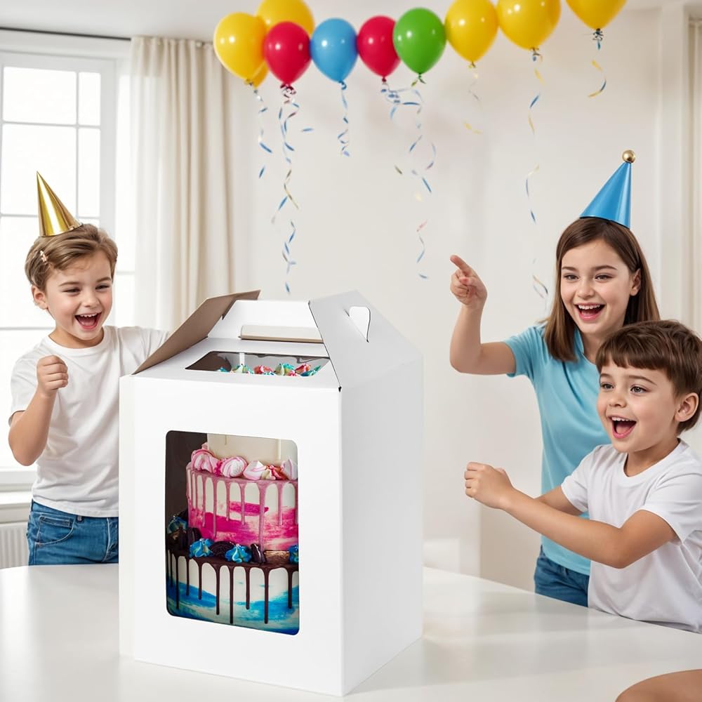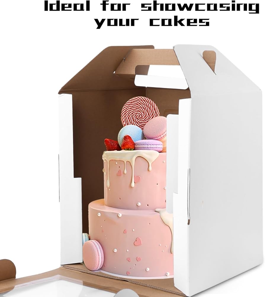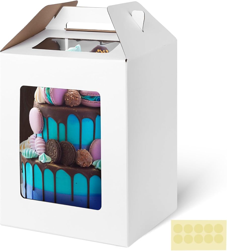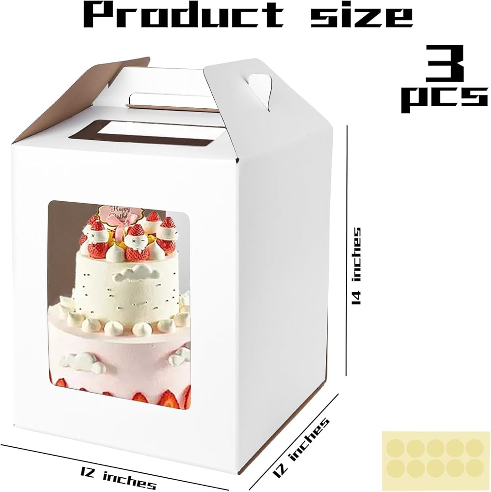 • صناديق كيك طويلة - تحتوي هذه المجموعة على 3 صناديق كيك بيضاء طويلة مع 12 ملصقًا شفافًا. مقاس كل صندوق 12 × 12 × 14 بوصة.