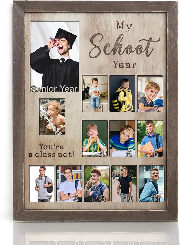 Capture precious memories and celebrate milestones with this versatile School Picture Frame. Designed to commemorate academic achievements from Pre-K through 12th grade and college, this wooden frame is the perfect graduation gift or party decor. With spaces to display photos from each school year, it allows you to showcase your child's growth and accomplishments in a cherished keepsake. Crafted from high-quality materials, this frame is both functional and visually appealing, making it a thoughtful present for parents, daughters, sons, or loved ones. Whether you're honoring a recent graduate or creating a sentimental collage, this School Picture Frame is a timeless way to preserve and share your academic journey. Measuring approximately 16 x 20 inches (40.6 x 50.8 cm), it's an ideal size for displaying on a wall, shelf, or tabletop.