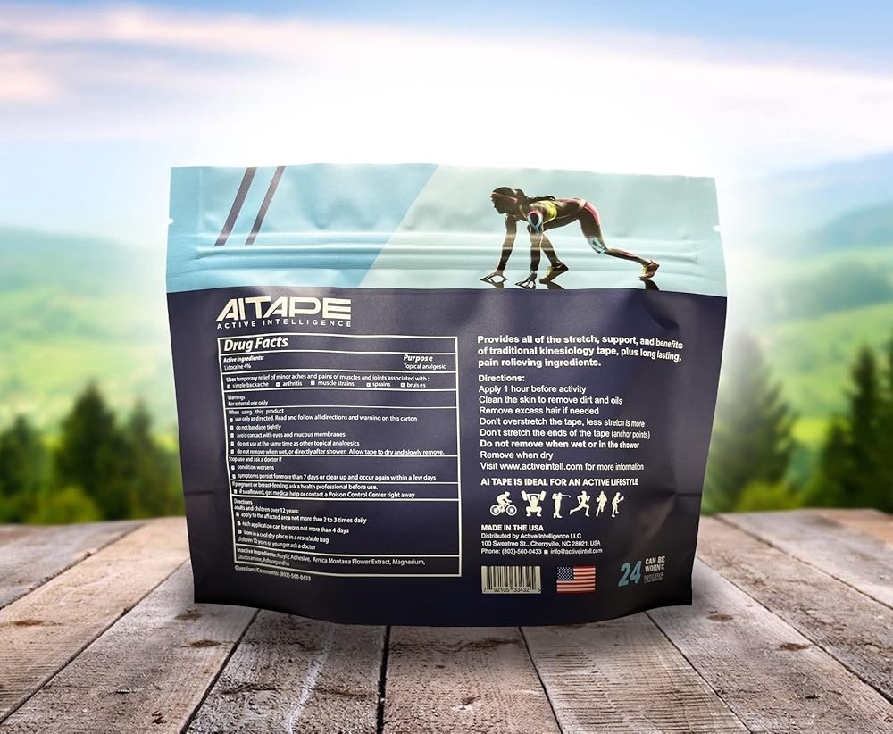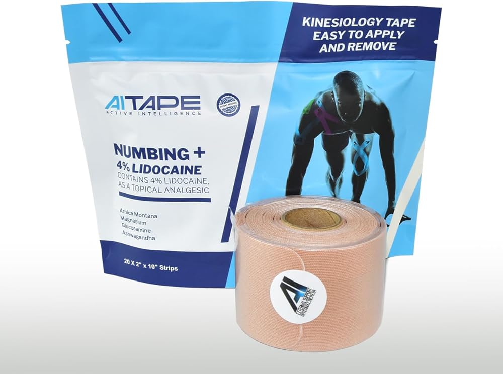 Package contains 20 Strips (2"x10") per roll. AI Kinesiology Tape is a specially formulated adhesive tape that is placed on the skin to support muscles and joints during physical activity and recovery. The active ingredient lidocaine in AI Tape Numbing + provides temporary relief of pain in the taped muscle or joint. Essentially, the tape provides all of the stretch, support, and benefits of traditional kinesiology tape, but with the added pain relieving active ingredient lidocaine. Active Ingredients: Lidocaine 4%. Inactive Ingredients: Arnica Montana Flower Extract, Magnesium, Glucosamine, Ashwagandga, and Acrylic Adhesive. When using this product: use only as directed. Read and follow all directions and warnings. Do not bandage tightly. Avoid contact with eyes and mucous membranes. Do not use at the time as other topical analgesics. Stop use and ask a doctor if: condition worsens, symptoms persist for more than 7 days or clear up and occur again within a few days. If pregnant or breast-feeding, ask a health professional before use. If swallowed, get medical help or contact a Poison Control Center right away.