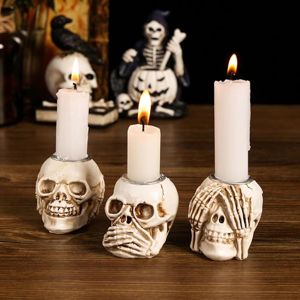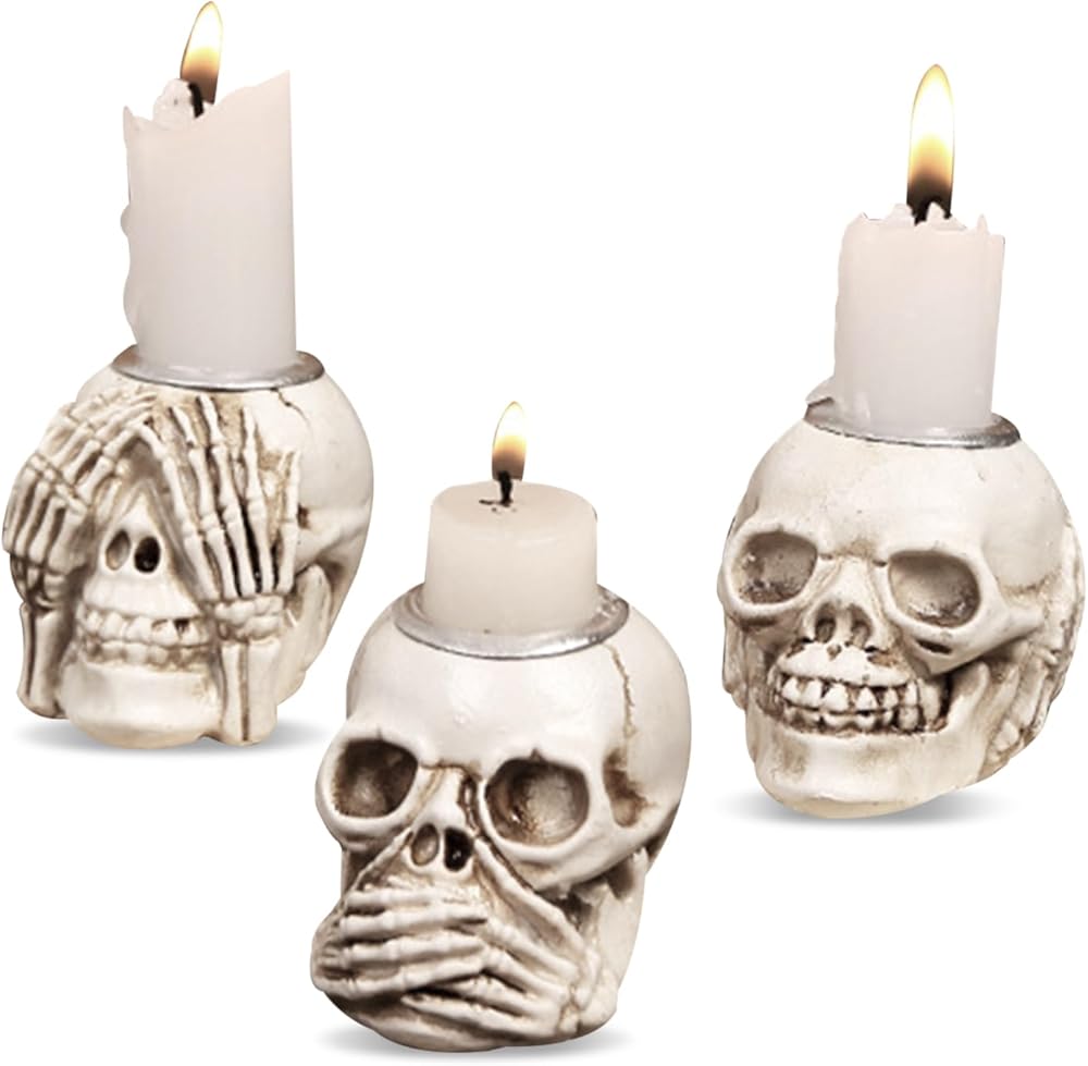Chris.W 3 Pcs Halloween Skull Candle Holder, Gothic Skeleton Candlestick Holder Resin Skeleton Candlestick Holder Retro Spooky Desktop Candleholders for Halloween Home Bar Party Graveyard Decor(White)
