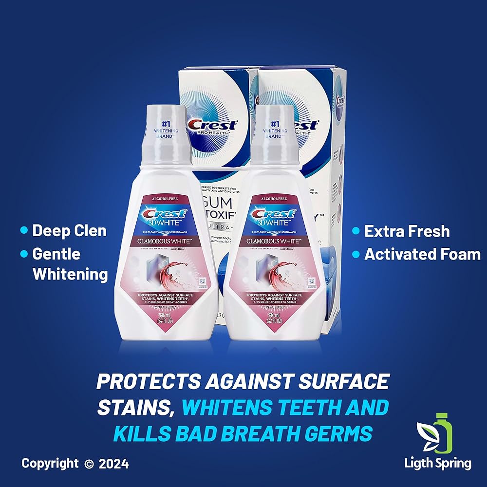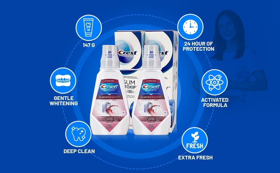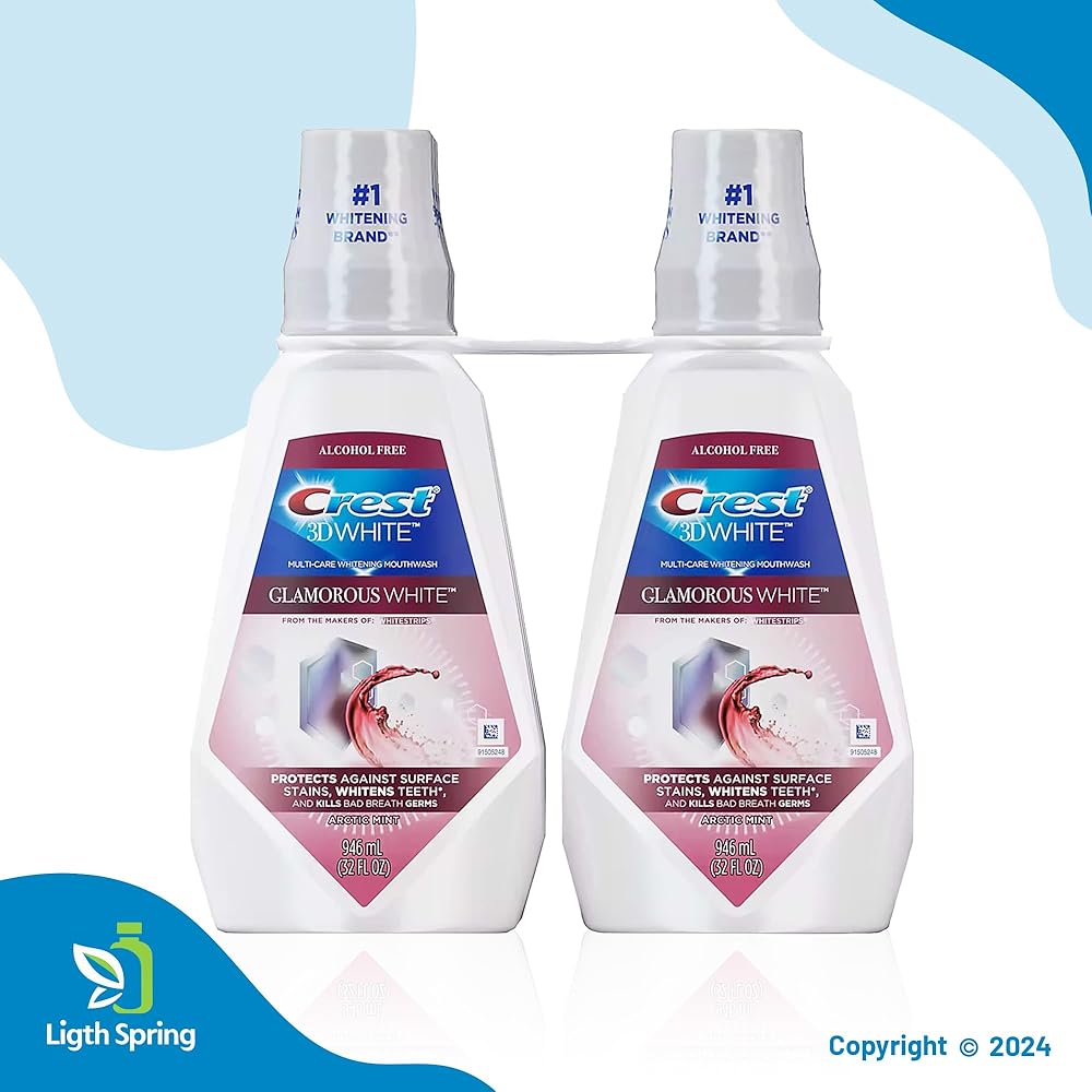 Crest 3D White Luxe Glamorous White Mouthwash, 2 pk./32 oz: This whitening rinse is designed to complement the toothpaste and provide additional whitening benefits. It contains ingredients like hydrogen peroxide and fluoride that help remove stains and deep clean your teeth. The refreshing mint flavor also leaves your mouth feeling clean and fresh.