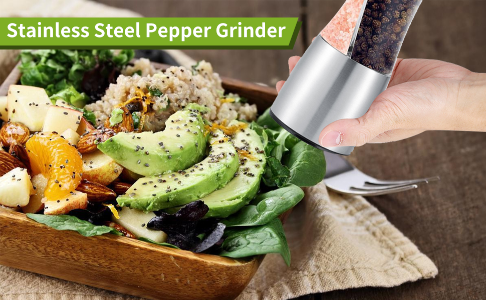 • جودة ممتازة. مطحنة الفلفل مصنوعة من الفولاذ المقاوم للصدأ عالي الجودة، ومقاومة للصدأ، ويمكن استخدامها لفترة طويلة. مجموعة مطحنة الفلفل الملح.