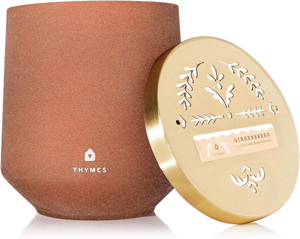 Thymes Gingerbread Large Candle: Welcome the spirit of the season with the decorative etched lid and sugar-coated finish of this fragrant candle. This holiday candle sets the mood for special moments and will complement any fall or winter home decor. --- Gingerbread Scented Candles: A comforting scent to be savored and shared. These fall candles are scented with notes of gingerbread, spicy cardamom, crystallized ginger, hints of dark vanilla, and a sprinkle of fresh-ground cinnamon. --- Candles 101: Trim wick to approximately ¼” before EVERY lighting to help make your Thymes jar candles burn longer. Before extinguishing your candle, liquified wax should reach most of the circumference of your candle, if possible. Make sure your decorative candles are placed away from other objects on a safe, heat-proof surface. Always practice basic rules of fire safety. Discontinue burning when ½” wax remains at the bottom of the glass candle jars to protect surfaces from heat exposure. --- About Us: At Thymes, we want to create a connection between beauty and fragrance. Our founder had a love of nature, a passion for art, and a desire to help people find beauty and balance in their lives. Our bath & body, home care, and home fragrance products are formulated with naturally derived, wholesome ingredients, rooted in botanical perfumery, inspiring everyone to slow down and connect with ourselves and with each other.